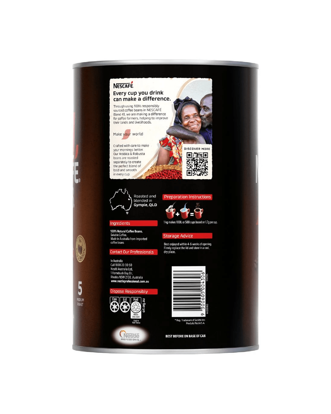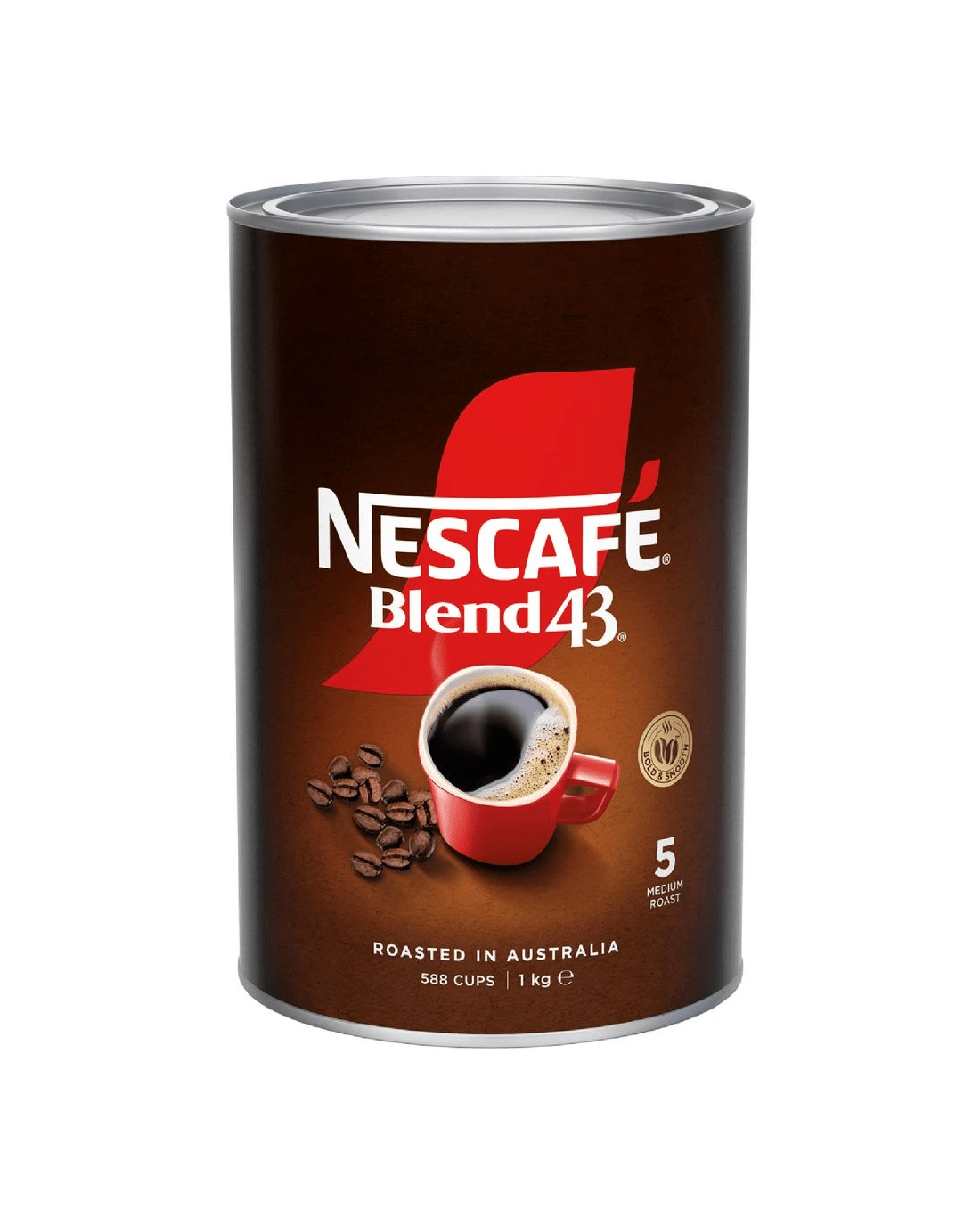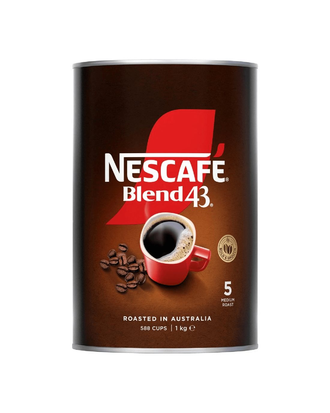 This Nescafe Blend 43 Coffee comes in a large 1 kg can so you can enjoy consistency with every cup of coffee. Proudly roasted and blended from Natural Coffee Beans right here in Australia, the bold Robusta and smooth Arabica coffee beans are individually roasted, bringing out their unique flavour and aroma. They're then blended together to create the perfect cup that is ideal for consumption in hotels, workplace tea rooms or at home when you're in a hurry.