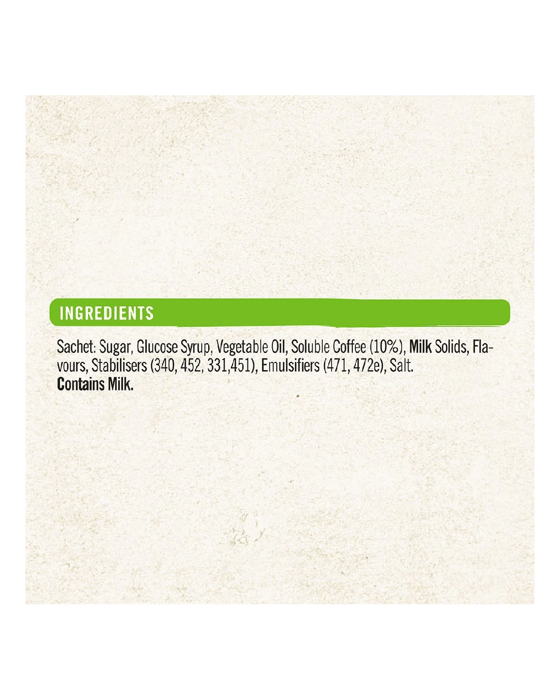 • Ingredients include Sugar, Glucose Syrup, Vegetable Oil, Soluble Coffee (10%), Milk Solids, Flavours, Stabilisers (340, 452, 331,451), Emulsifiers (471, 472e), Salt.