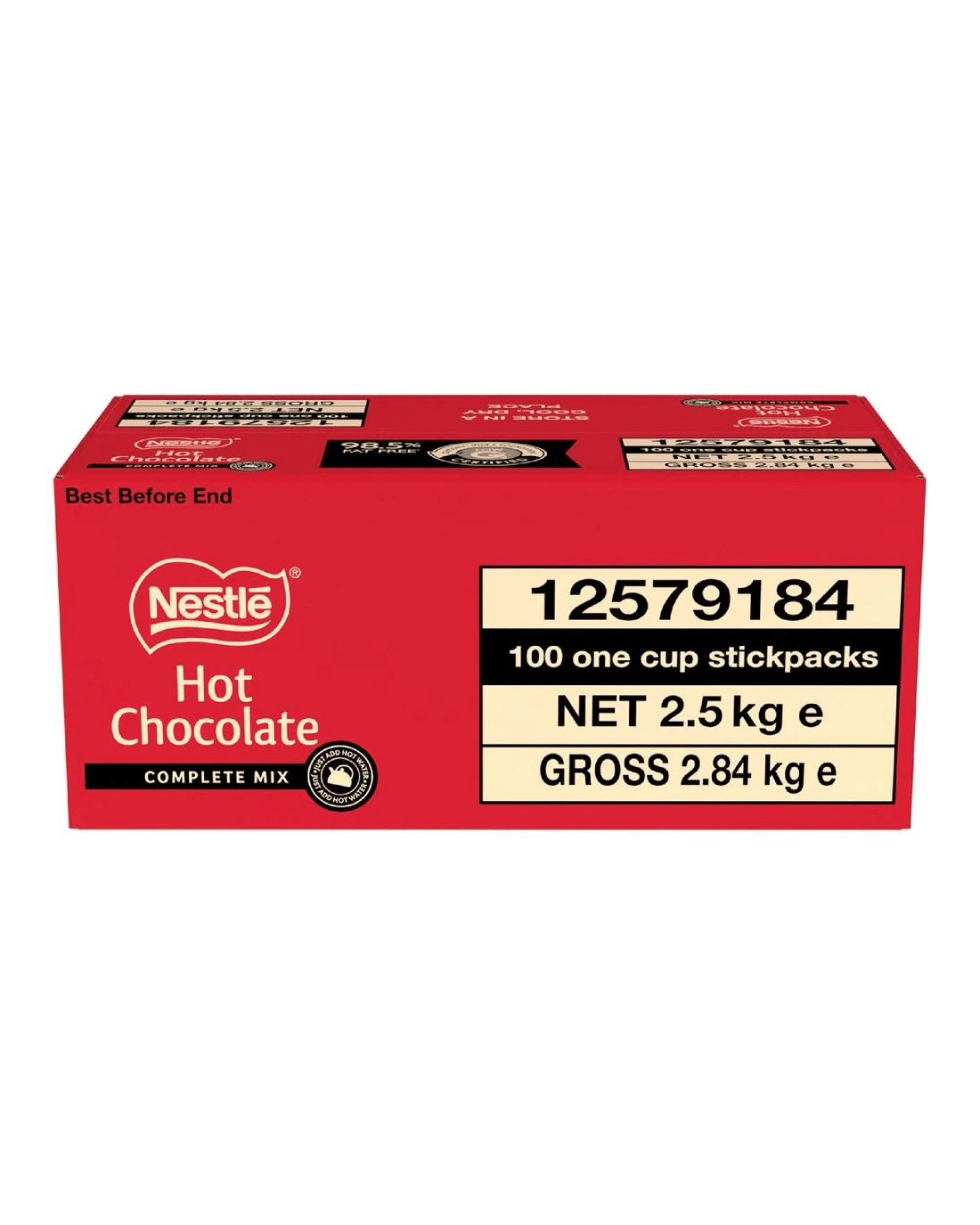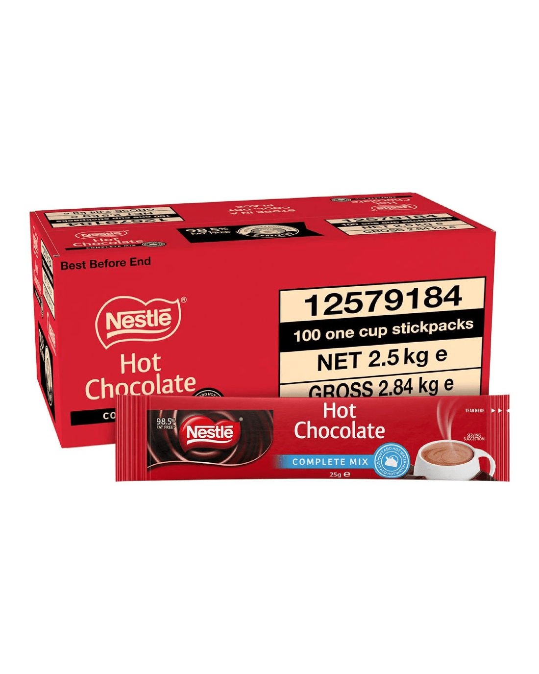 Enjoy a tasty beverage with the Nestle Hot Chocolate Mix. Each sachet provides the core of a mouth-watering chocolate drink you can enjoy in a hot or cold manner. This pack comes with 100 25 g sachets, making it a great addition to the workplace pantry.