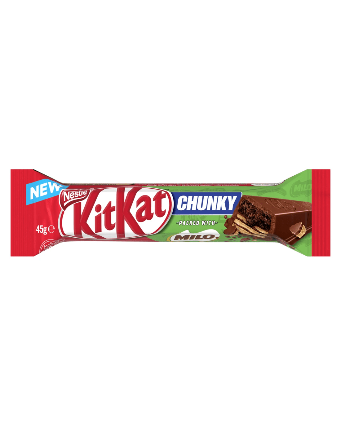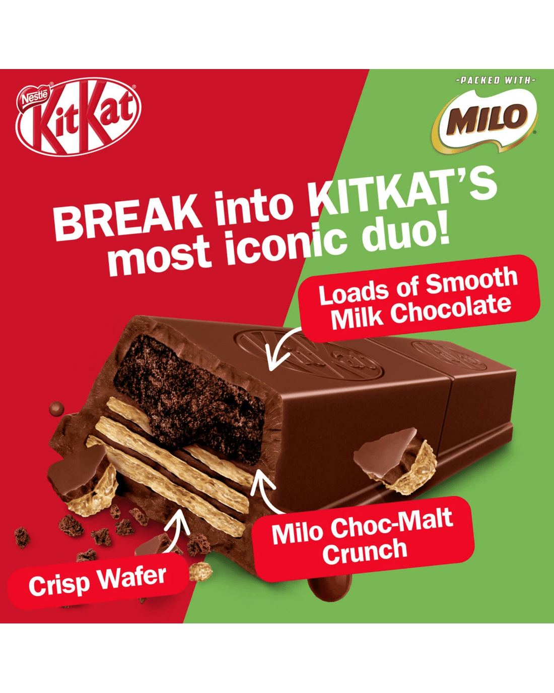 Break into KitKat's most iconic duo - KitKat packed with Milo chunky! Crisp wafer finger with three breakable chunks, packed with Milo filling, all covered in deliciously smooth milk chocolate.