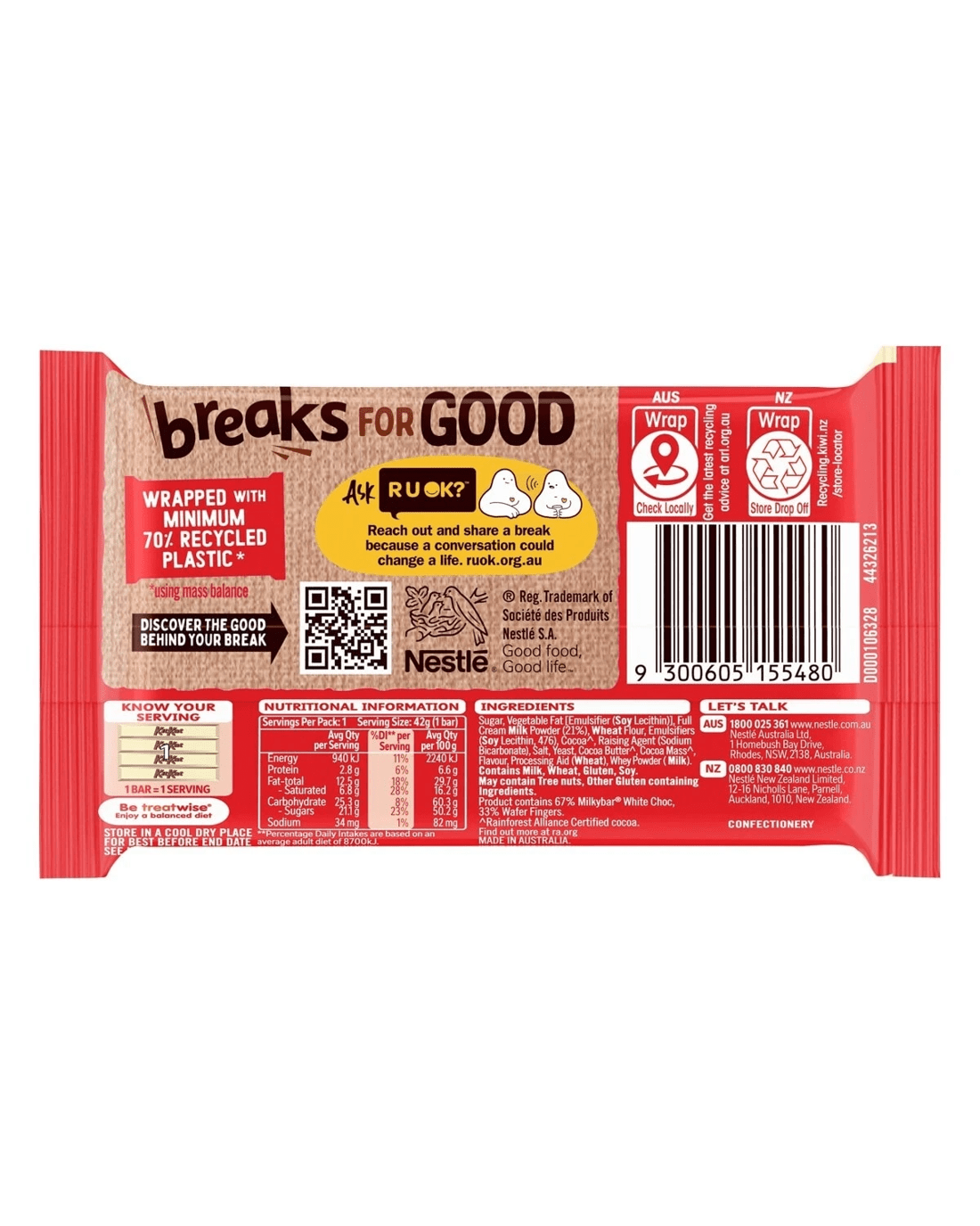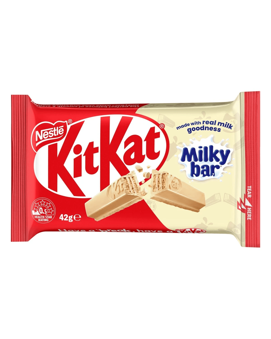 Break into KitKat with Milkybar to discover a different way to break. The perfect balance of smooth and creamy Milkybar white choc and crispy wafer. Official chit-chat partner of R U OK?, starting meaningful conversations with colleagues, friends and family, Proudly made in our Australian factory, in Campbellfield, Victoria. Have a break, have a KitKat.