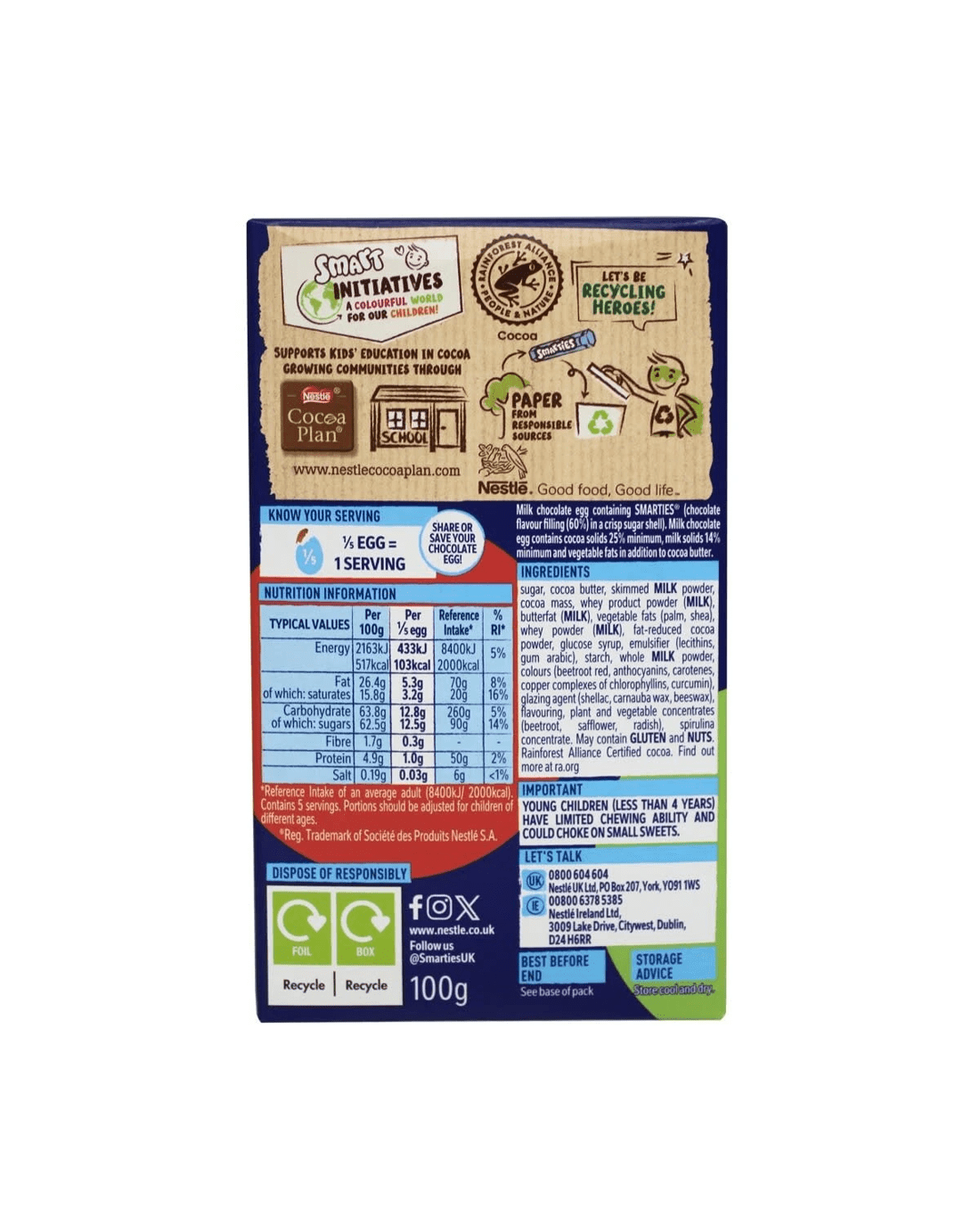 - Ingredients: Sugar, Cocoa Butter, Skimmed Milk Powder, Cocoa Mass, Whey Product Powder (Milk), Butterfat (Milk), Vegetable Fats (Palm, Shea), Whey Powder (Milk), Fat-Reduced Cocoa Powder, Glucose Syrup, Emulsifier (Lecithins, Gum Arabic), Starch, Whole Milk Powder, Colours (Beetroot Red, Anthocyanins, Carotenes, Copper Complexes of Chlorophyllins, Curcumin), Glazing Agent (Shellac, Carnauba Wax, Beeswax), Flavouring, Plant and Vegetable Concentrates (Beetroot, Safflower, Radish), Spirulina Concentrate
