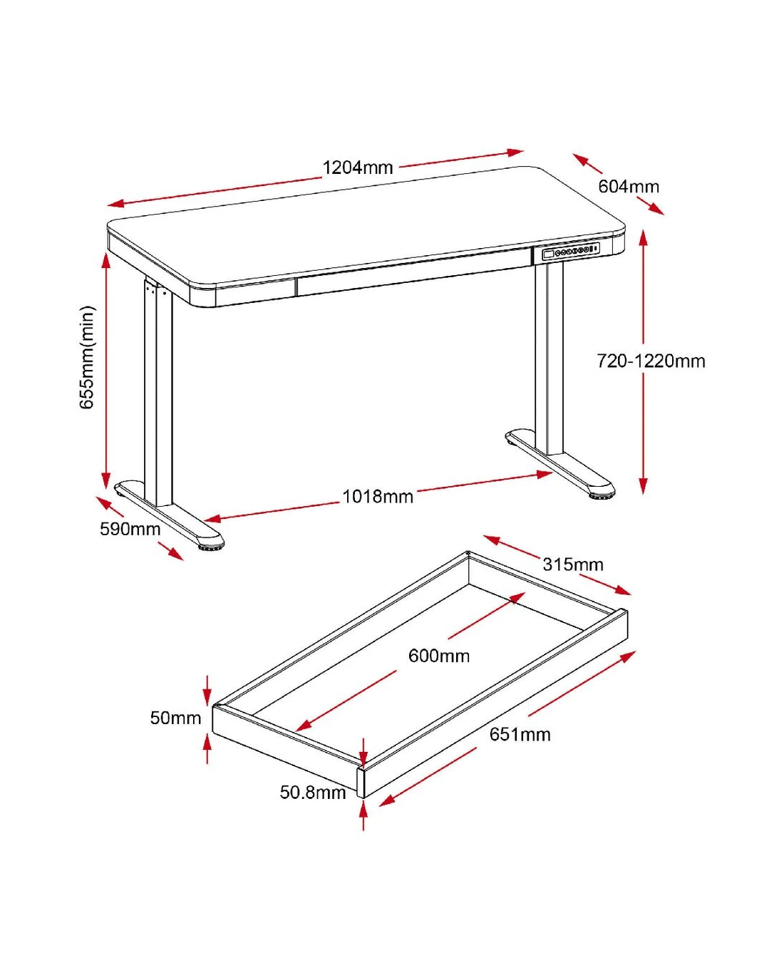 - Once assembled, this desk measures 1204 W x 604 D x 720 - 1220 H mm.