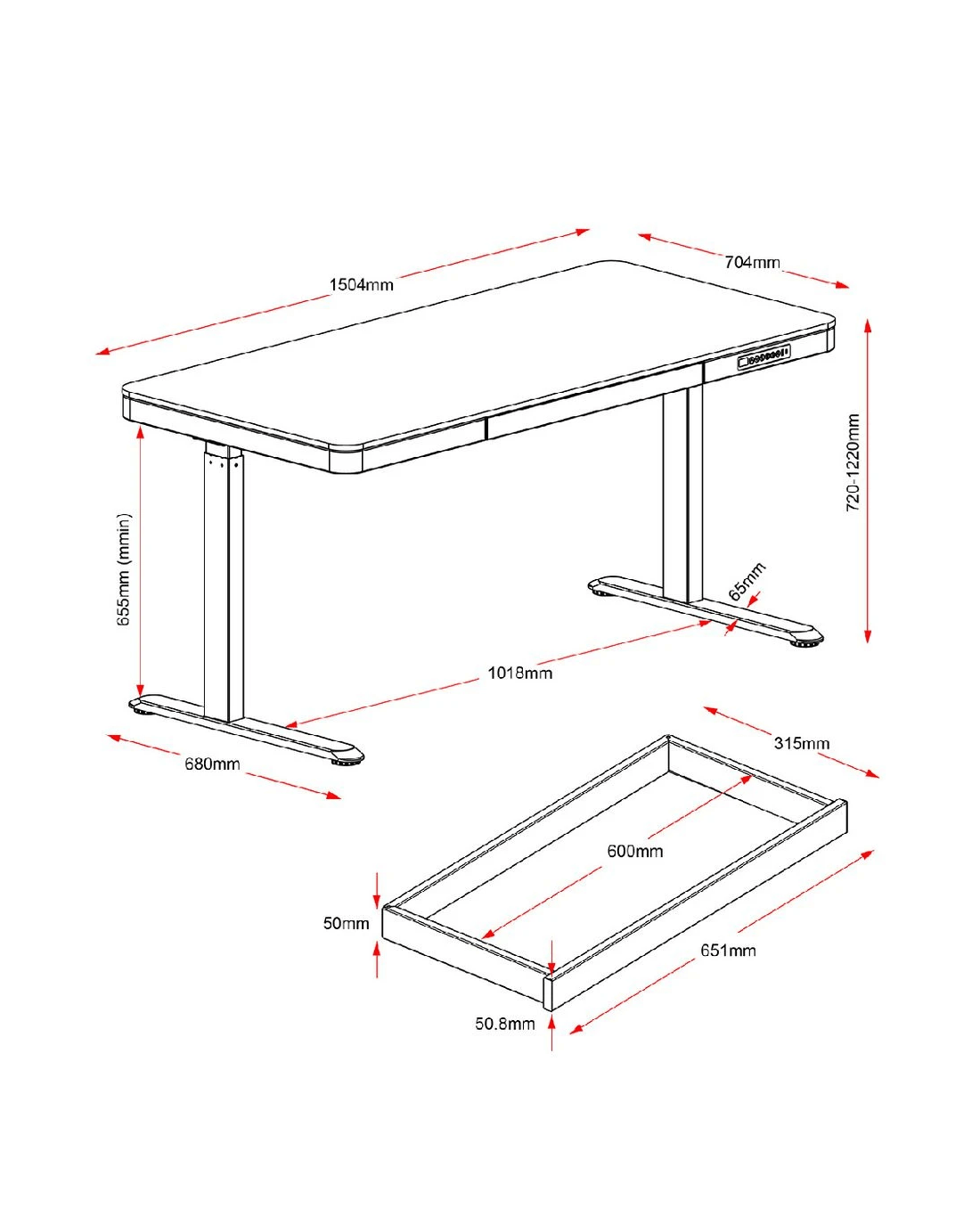 • Once assembled, this desk measures 1504 W x 704 D x 720 - 1220 H mm.