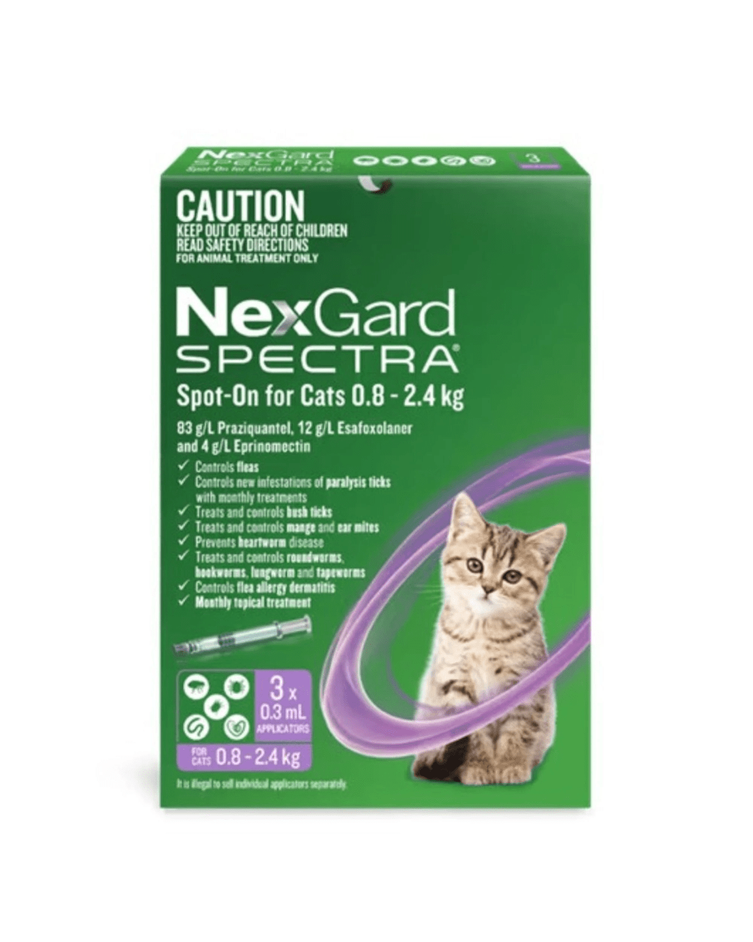 NexGard Spectra Spot-On for Cats is a breakthrough all-in-one parasite prevention treatment for cats. This highly efficacious monthly treatment kills external parasites like fleas, paralysis ticks, bush ticks, notoedric mange, and ear mites, as well as internal parasites like heartworms, roundworms, hookworms, lungworms, and tapeworms, including flea tapeworms and cat tapeworms. It also helps control flea allergy dermatitis in cats.