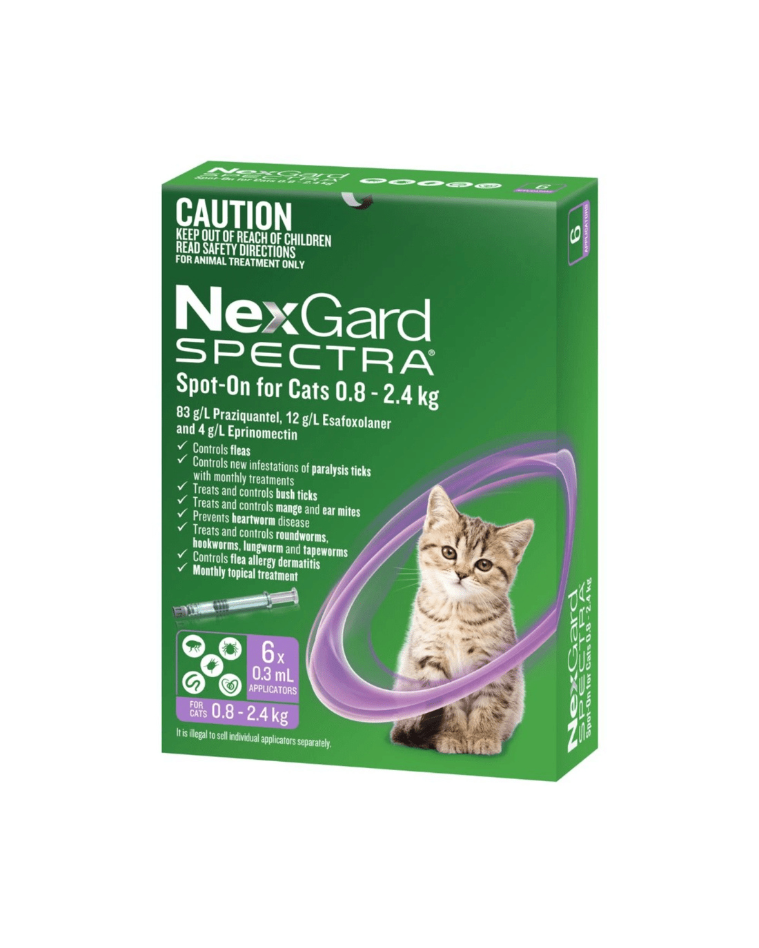 NexGard Spectra Spot-On for Cats is a breakthrough all-in-one parasite prevention treatment for cats. This highly efficacious monthly treatment kills external parasites like fleas, paralysis ticks, bush ticks, notoedric mange, and ear mites, as well as internal parasites like heartworms, roundworms, hookworms, lungworms, and tapeworms, including flea tapeworms and cat tapeworms. It also helps control flea allergy dermatitis in cats.