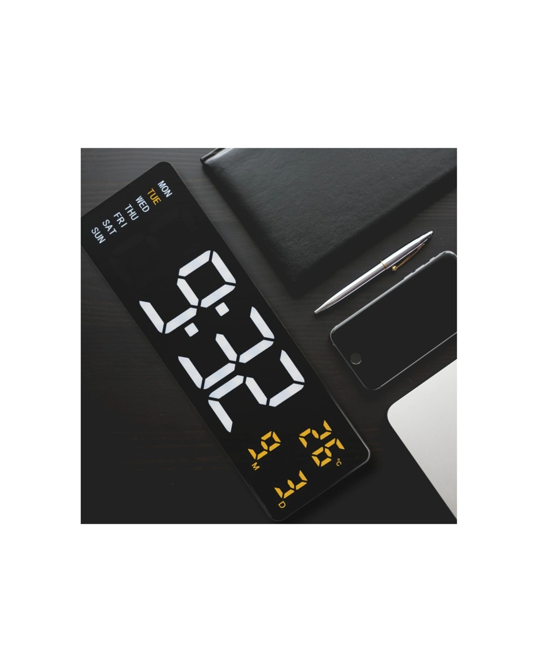 Display: Large LED screen showing time, date, temperature, and day