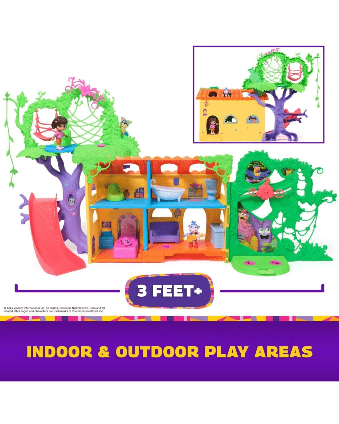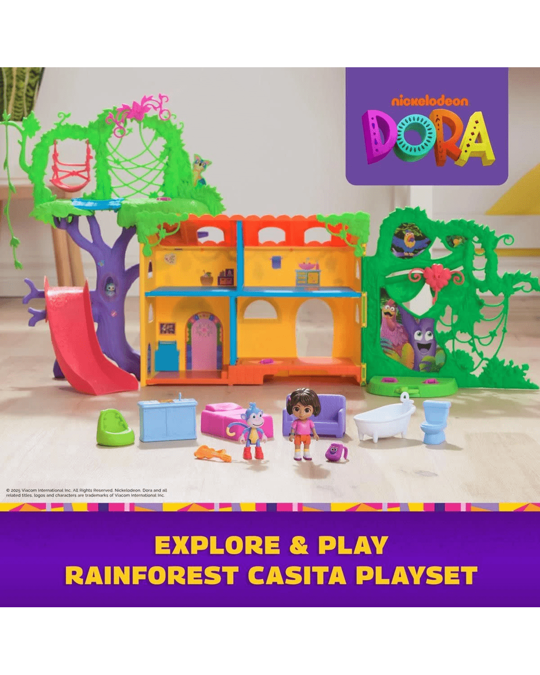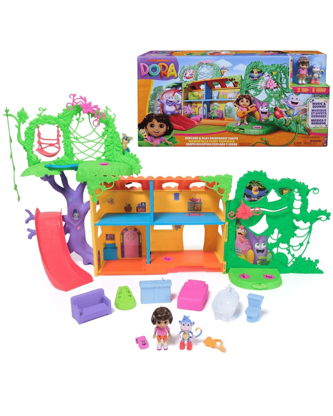 Bring the world of Dora to life with the Explore and Play Rainforest Casita Playset! Spanning 3ft. wide, this casita offers endless fun, with rooms to decorate and outdoor adventures like swinging, sliding and climbing. Includes Dora and Boots figures, plus Dora’s iconic sidekick—Backpack. Whether it's dancing on the spinning floor or a surprise visit from Swiper, this playset encourages imaginative play. Outside, the figures can swing on the 'Jungle Vine', cross the 'Wobbly Bridge' and much more. Inside, explore multiple play areas, decorate with doll house furniture and activate sounds and bilingual phrases with the button in the living room! Step into the world of Dora, with toddler toys that will make magical birthday, Christmas and holiday gifts for girls and boys that love pretend play toys, like dolls and accessories, dollhouse furniture and munecas para ninas. For even more thrilling adventures with Dora the explorer, build your very own 'World of Dora' with the Rainforest Casita doll house—a casa de munecas that looks just like Dora’s house in the showand gift packs with lovable action figures and must-have accessories, or interactive dolls, super-cute plushies and pretend play musical instruments that’ll have fans rocking out like the big kids. (each sold separately)
