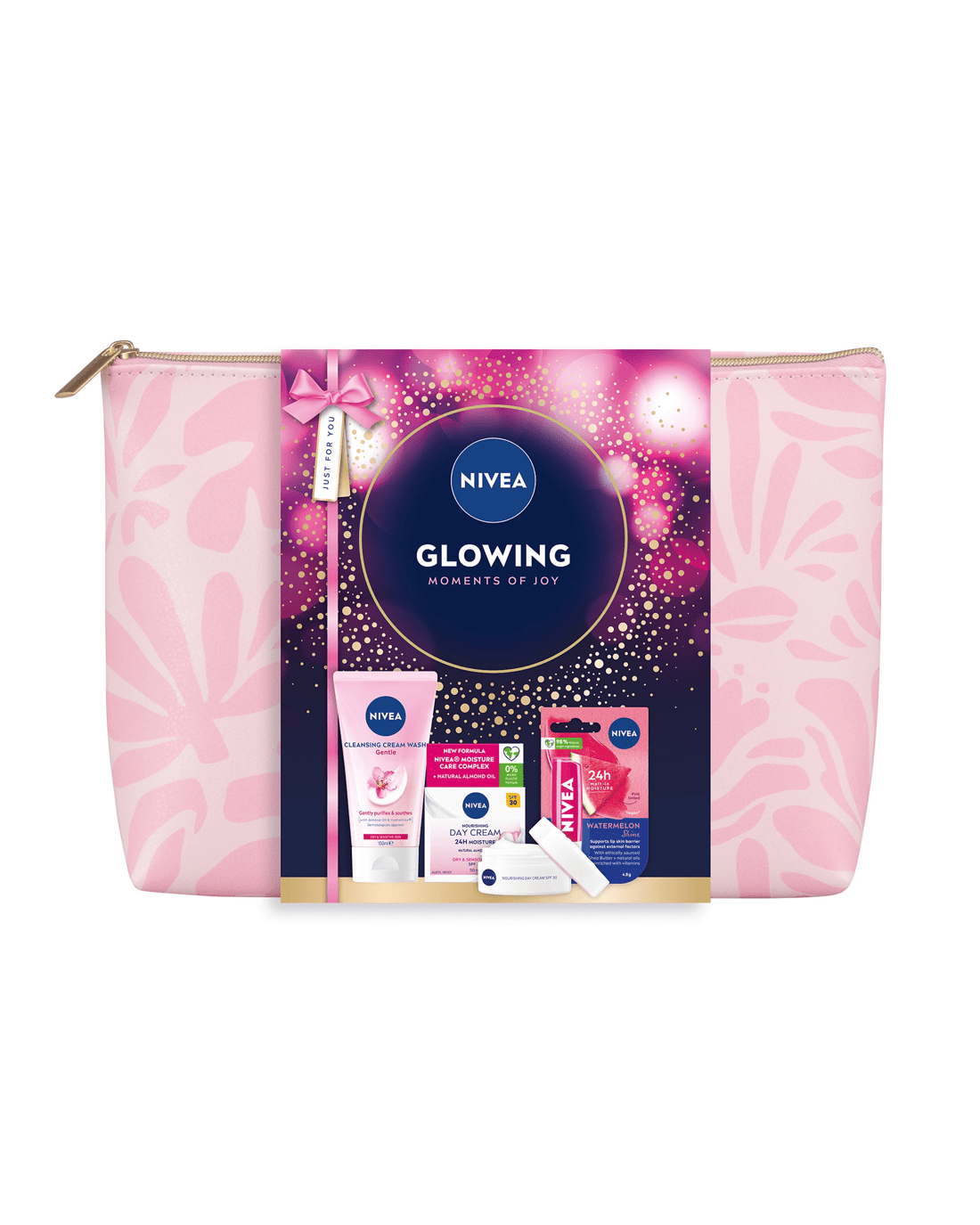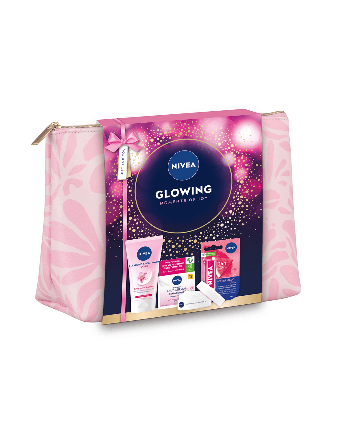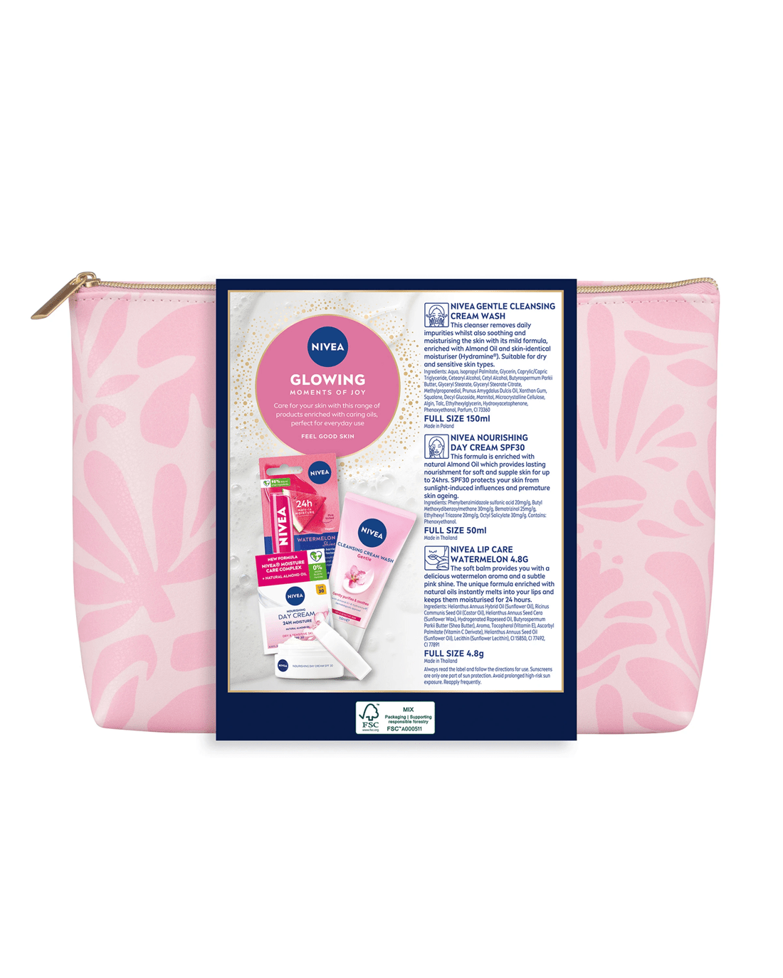 • Includes 1 x Nivea Gentle Cleansing Cream Wash, 1 x Nivea Nourishing Day Cream SPF 30, 1 x Nivea Watermelon Shine Lip Balm and 1 x wash bag