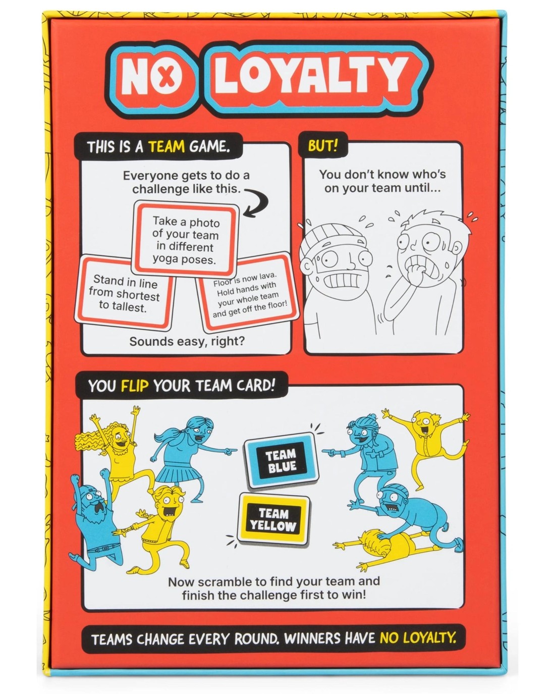 Scream, scramble, switch sides — trust no one, win anyway! The loudest and most disloyal party game you'll ever play. This is a team game where everyone gets to do a challenge. Sounds easy, right? But, you don't know who's on your team until... you flip your team card! Now scramble to find your team and finish the challenge first to win! Teams change every round, winners have NO LOYALTY! Ages: 7 + | Players: 4 - 20 + | Playtime: 15 min