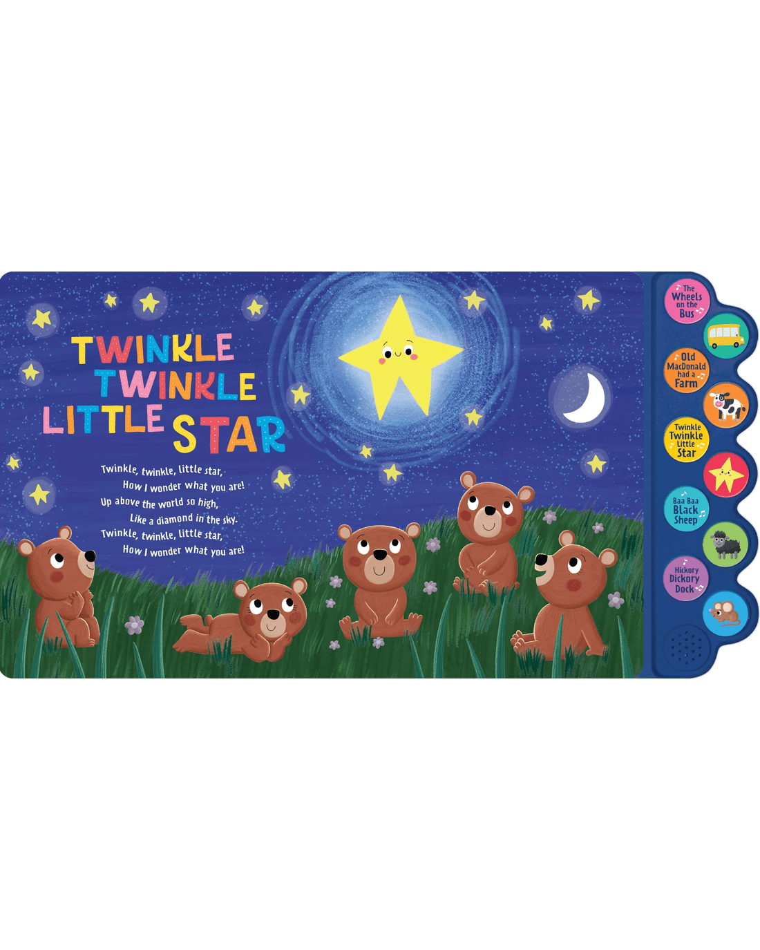 Press the buttons to hear instrumental renditions of famous nursery rhymes, as well as short like cows mooing and buses honking. The sounds, along with familiar text of beloved nursery rhymes, enrich the reading experience with a touch of musical magic.