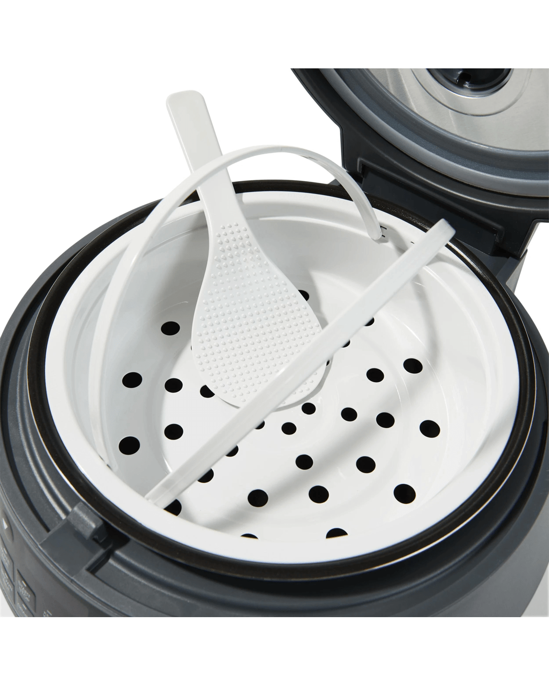 - Includes cooker base, inner cooking pot, measuring scoop, steaming basket and rice spatula