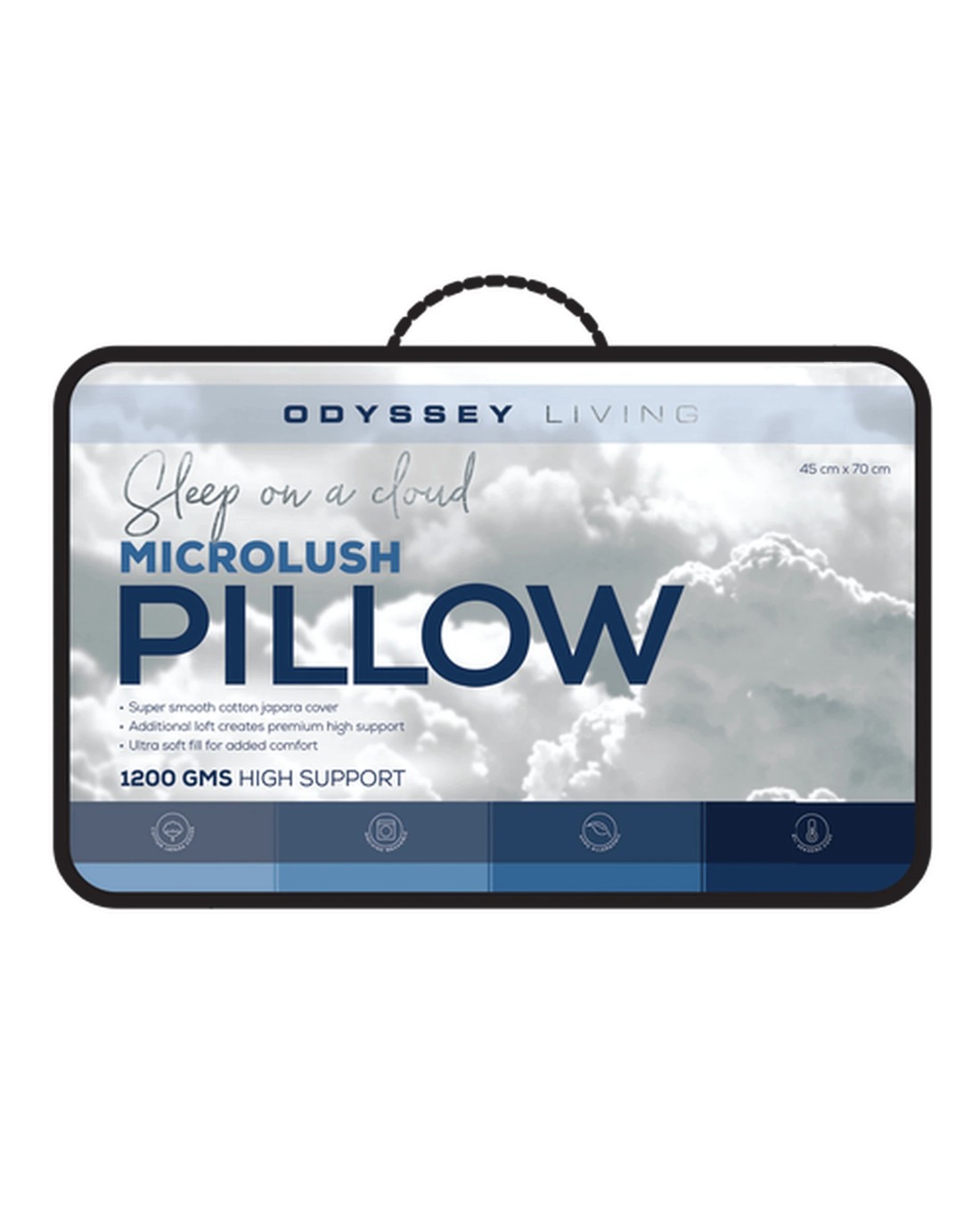 Sleep on a cloud with the Microlush pillow range by Odyssey Living. With a super smooth cotton japara cover, additional loft to create premium high support, and an ultra soft fill for added comfort.