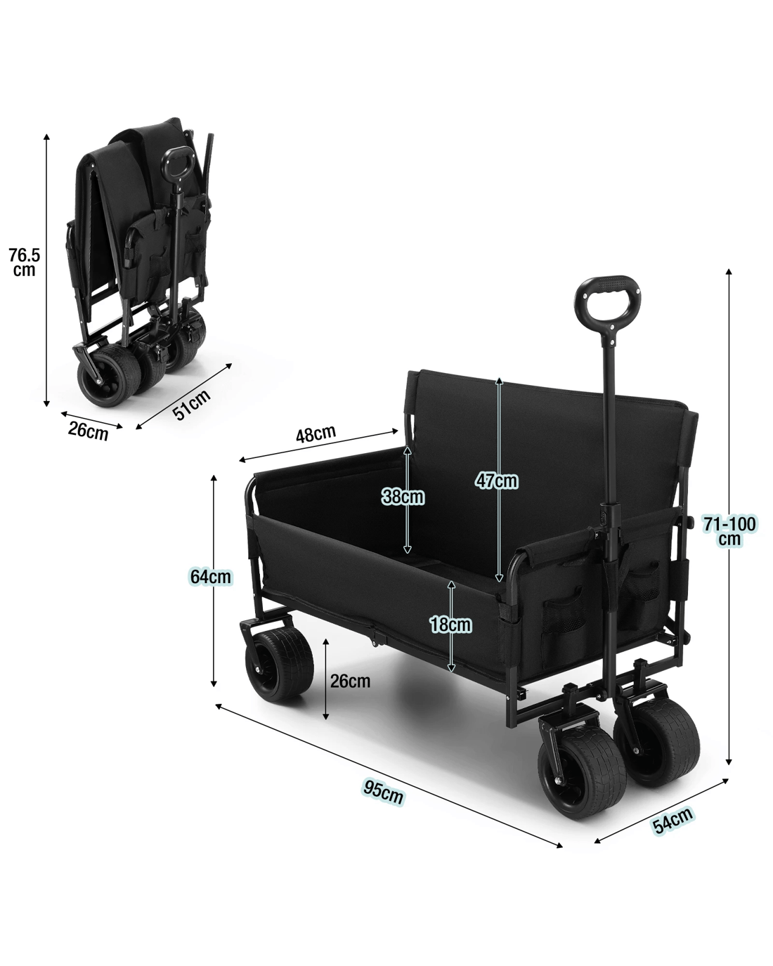 - High Capacity & Durable Material: Constructed with a heavy-duty metal frame and welded construction, this folding cart offers exceptional stability and durability. The utility wagon features waterproof 600D fabric with a PVC coating, capable of supporting up to 150kg for efficient heavy-load transport. Dimensions: 95 x 54 x 71 cm; Folding Size: 76.5 x 51 x 26 cm.