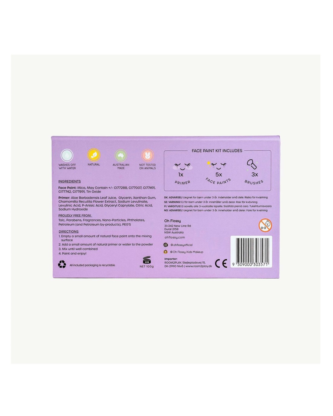 Ingredients: Natural Face Paints (mica, may contain CI77288, CI77007, CI77491, CI77742, CI77891, tin oxide), Natural Primer (aloe vera leaf juice, glycerin, xanthan gum, chamomile extract, sodium levulinate, levulinic acid, p-anisic acid, glyceryl caprylate, citric acid, sodium hydroxide)
