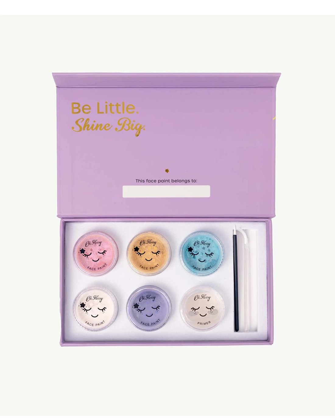 The set includes six small containers of hypoallergenic, vegan, and non-toxic face paints in various colours, each with a cute face design on the lid. It also features a natural primer and two mini brushes, making application simple and ensuring long-lasting, crack-free face art. Perfect for sensitive skin, the paints are formulated without fillers or preservatives, providing a safe and fun experience for children.