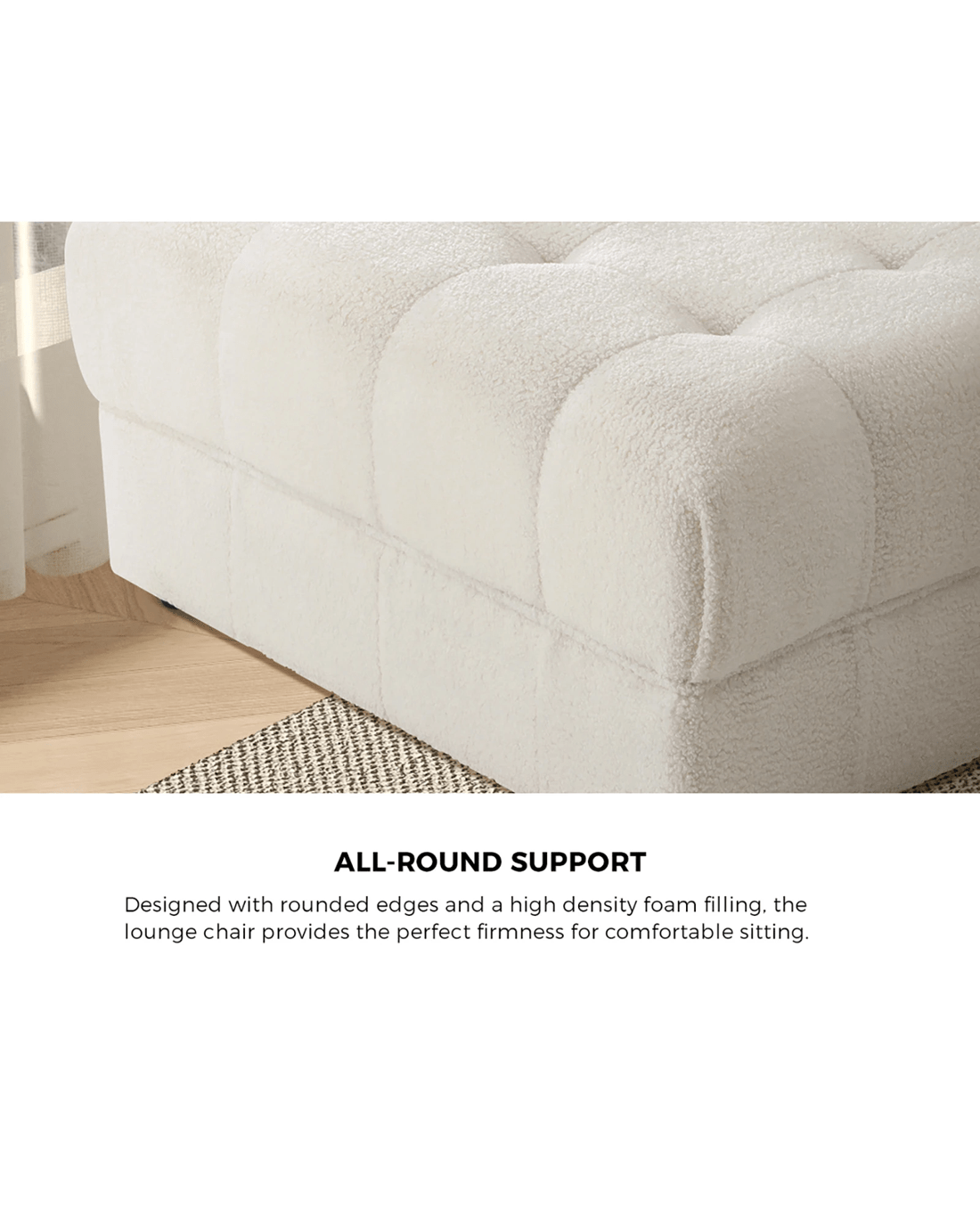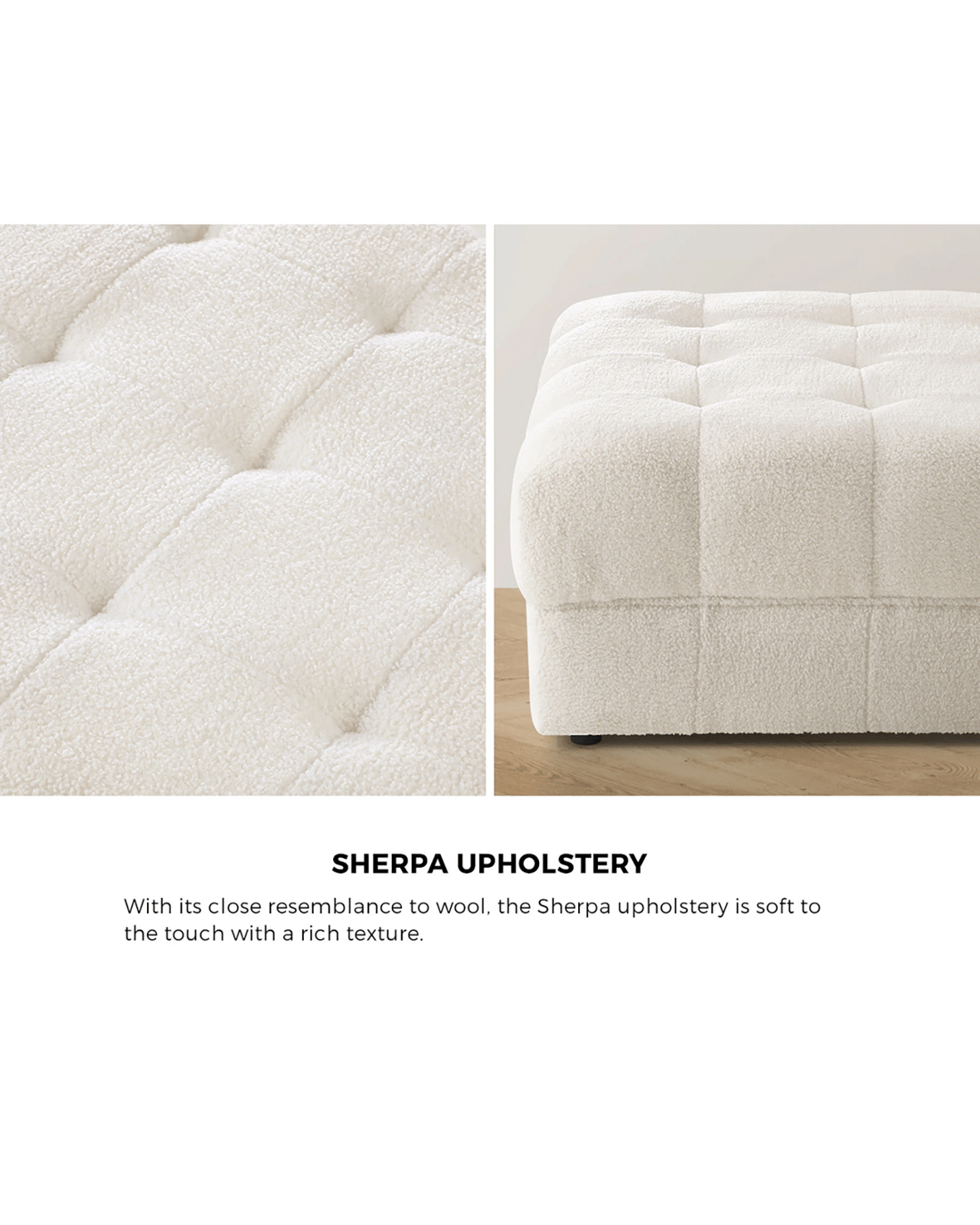 With its close resemblance to wool, the Sherpa upholstery is soft to the touch with a rich, cosy texture. A tufted sitting surface further signifies to its premium quality. Undoubtedly, the luxurious factor is always up close and personal. Design-wise, the ottoman is extremely inviting with its wide and ample proportions to accommodate any person with minimum hassles. Plus, rounded edges and a high density foam filling also provide the perfect firmness for all-round comfortable sitting. As to its durability, the ottoman features a strong pine wood frame and displayed with fine workmanship, meticulous needlework and stitching, and near flawless finishing.