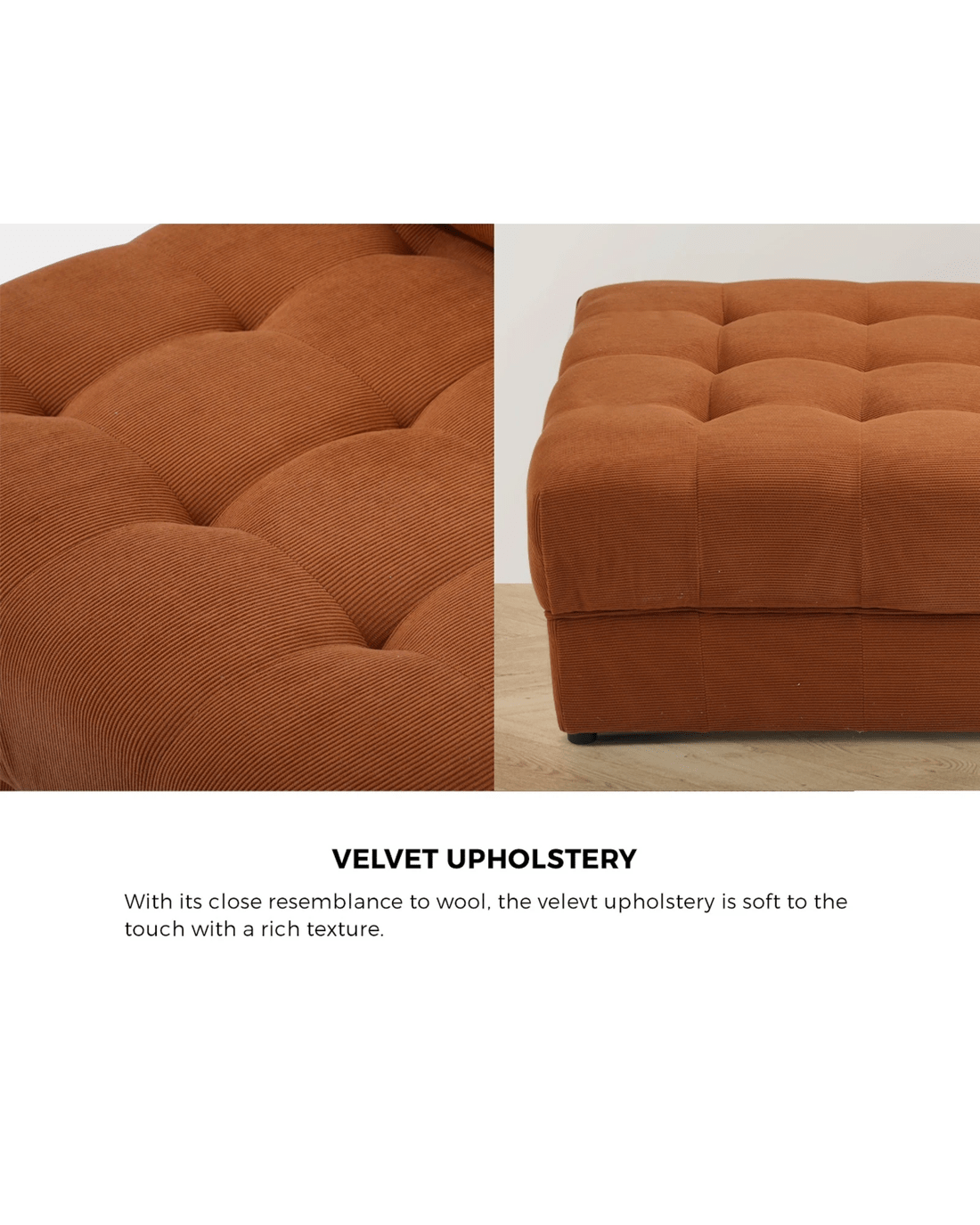 With its close resemblance to wool, the Velvet upholstery is soft to the touch with a rich, cosy texture. A tufted sitting surface further signifies to its premium quality. Undoubtedly, the luxurious factor is always up close and personal. Design-wise, the ottoman is extremely inviting with its wide and ample proportions to accommodate any person with minimum hassles. Plus, rounded edges and a high density foam filling also provide the perfect firmness for all-round comfortable sitting. As to its durability, the ottoman features a strong pine wood frame and displayed with fine workmanship, meticulous needlework and stitching, and near flawless finishing.