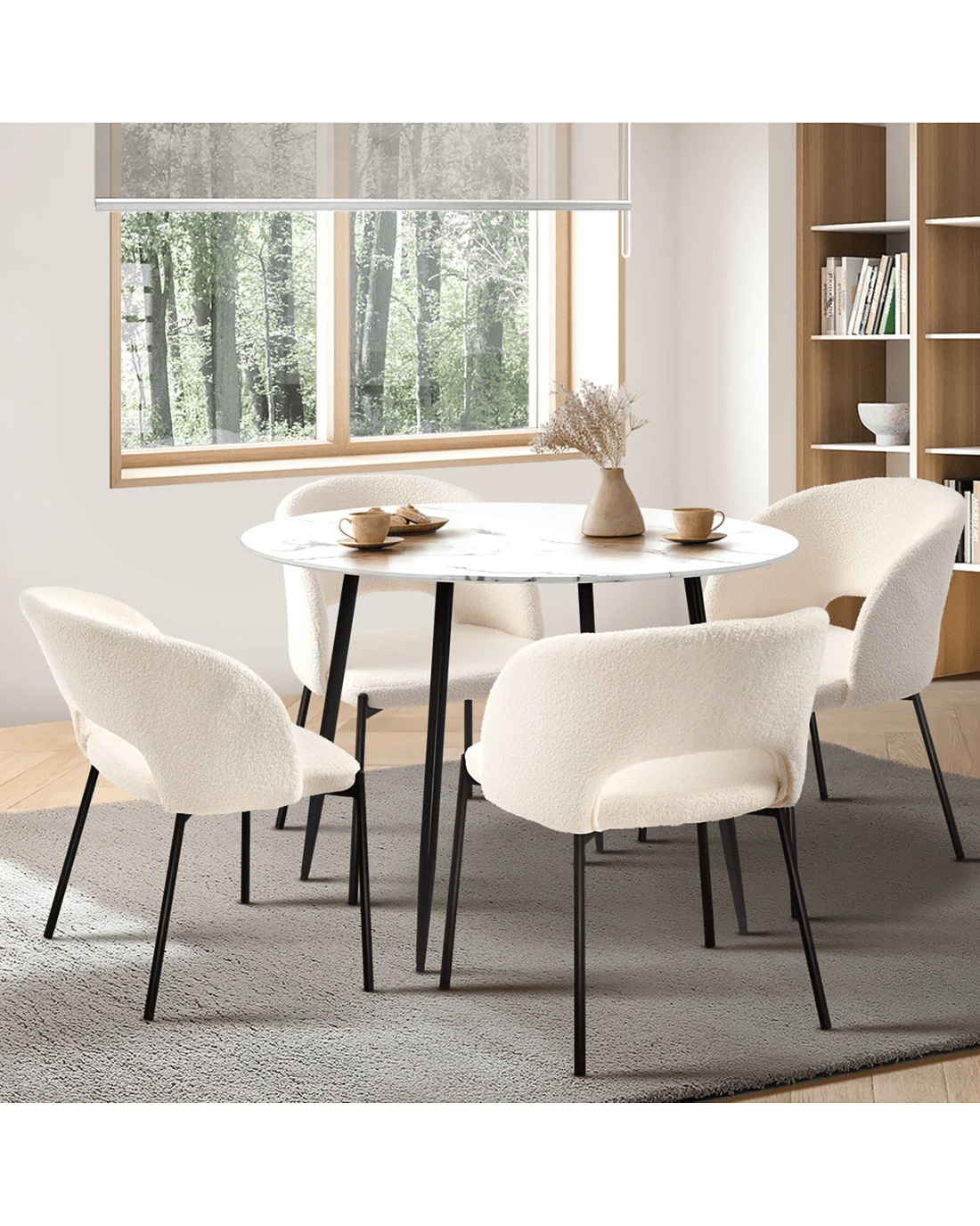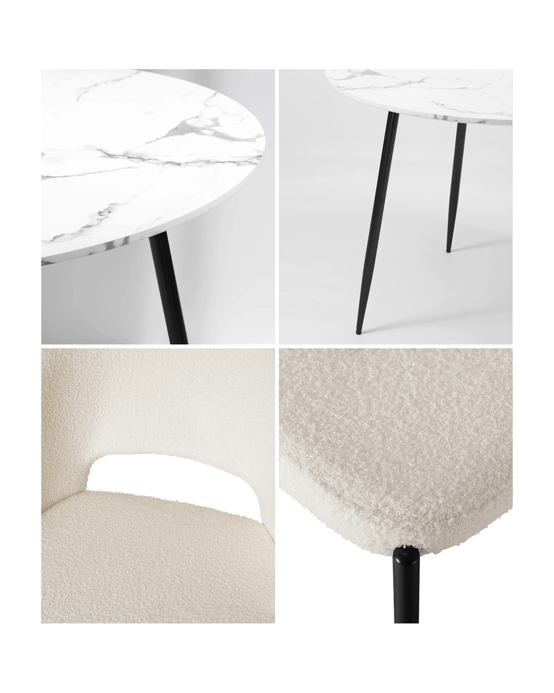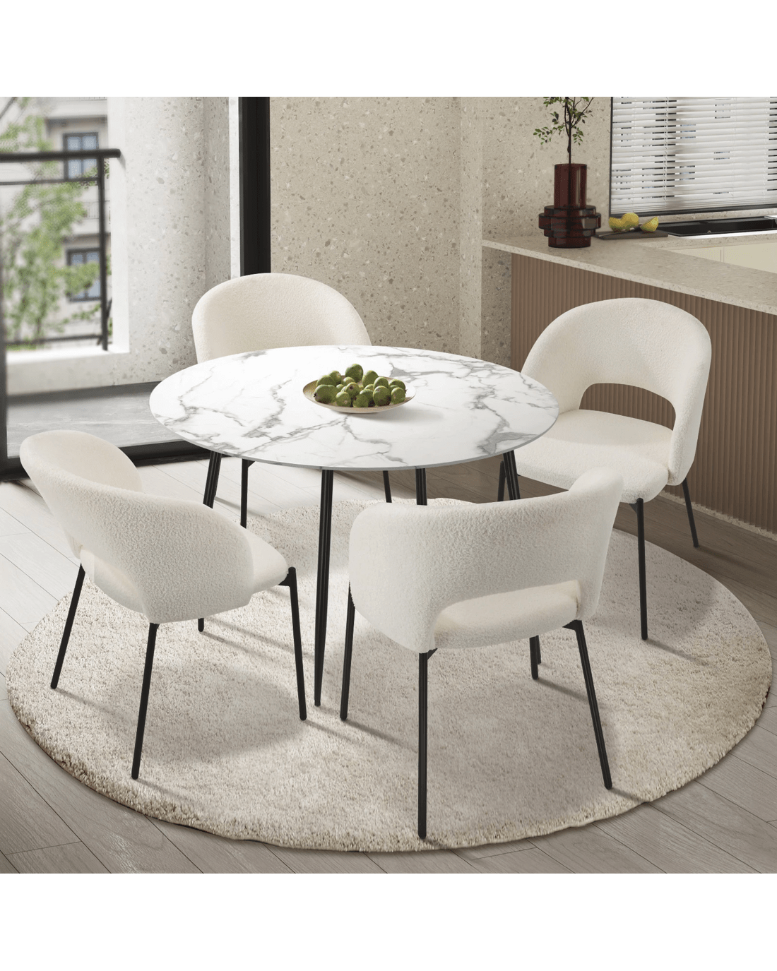 Immerse yourself in the epitome of modern elegance with our Dining Table and Sherpa Dining Chairs Set by Oikiture. The sleek lines of the contemporary dining table set the stage for a dining experience that seamlessly blends sophistication with comfort. Paired with our sumptuous Sherpa Dining Chairs, the set becomes a statement piece that captures attention and admiration.