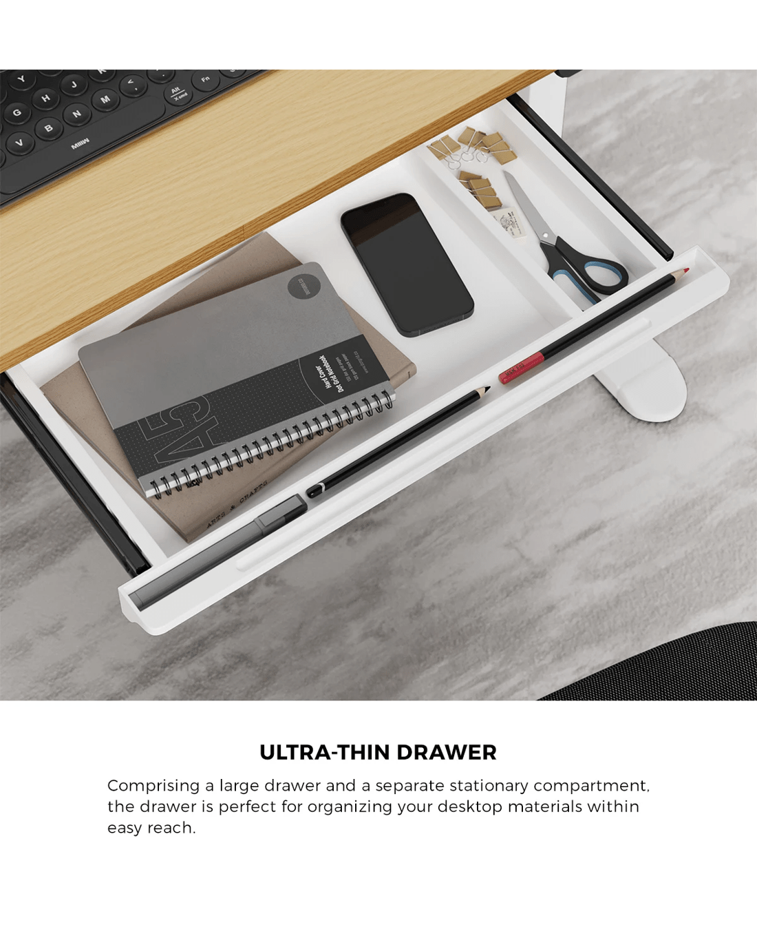 Not least, an ultra-thin drawer is aptly included with the desktop to help organise and keep all your desktop working paraphernalia close at hand within a spacious drawer and separate stationary compartment.