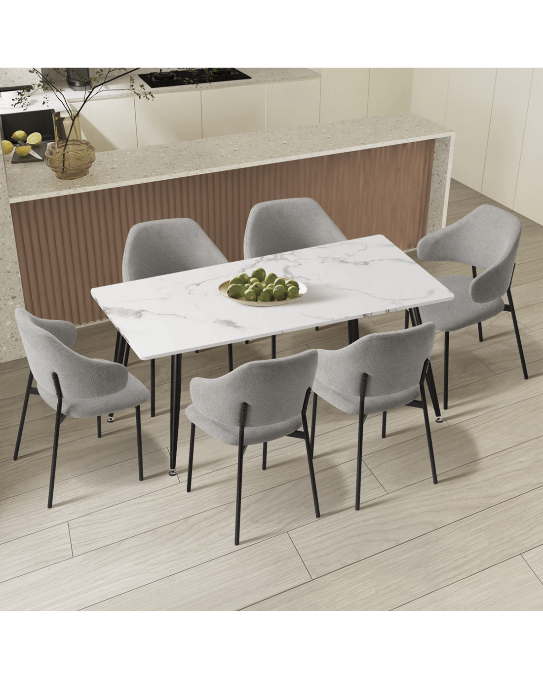 Discover the versatility of this set as it effortlessly accommodates both casual family dinners and formal gatherings. The spacious dining table and inviting Fabric Dining Chairs create an atmosphere conducive to intimate conversations and memorable shared moments, making it the perfect addition to your dining repertoire.