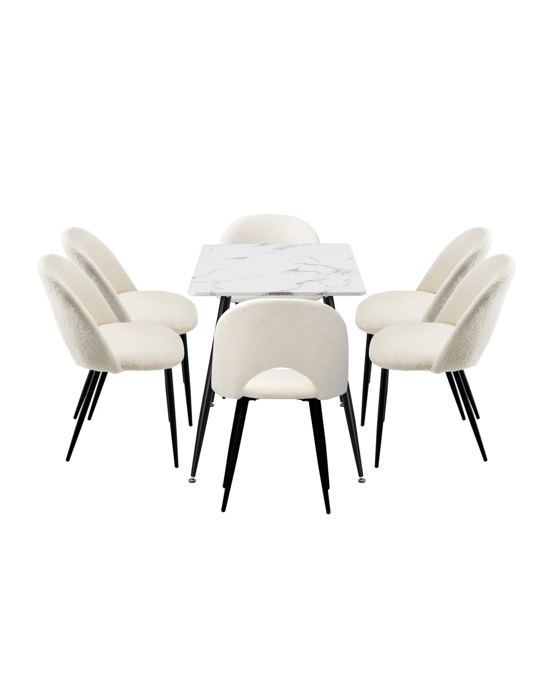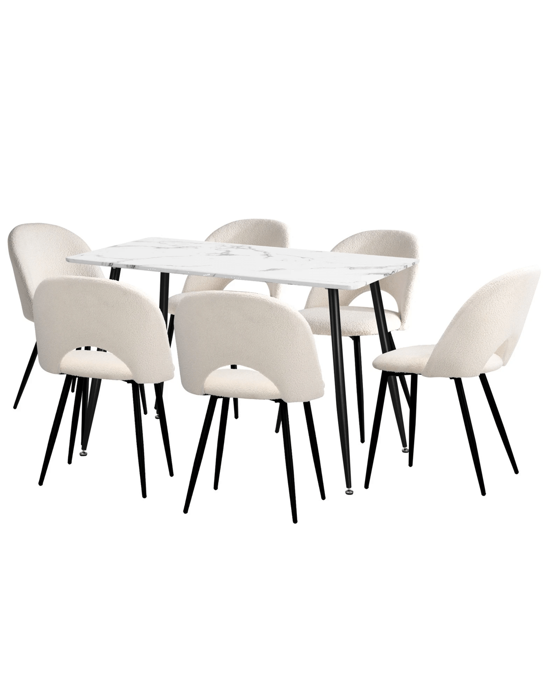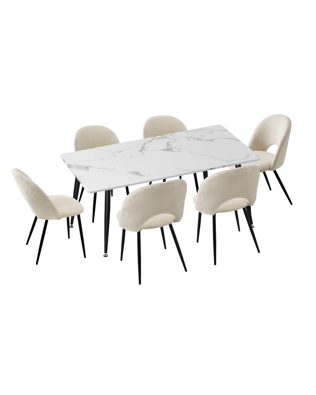 Immerse yourself in the epitome of modern elegance with our Dining Table and Sherpa Dining Chairs Set by Oikiture. The sleek lines of the contemporary dining table set the stage for a dining experience that seamlessly blends sophistication with comfort. Paired with our sumptuous Sherpa Dining Chairs, the set becomes a statement piece that captures attention and admiration.