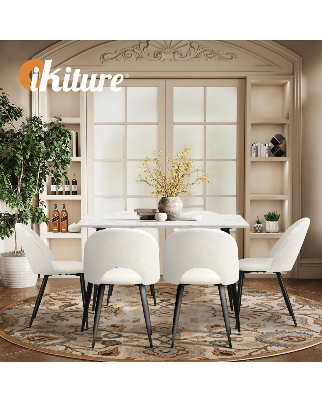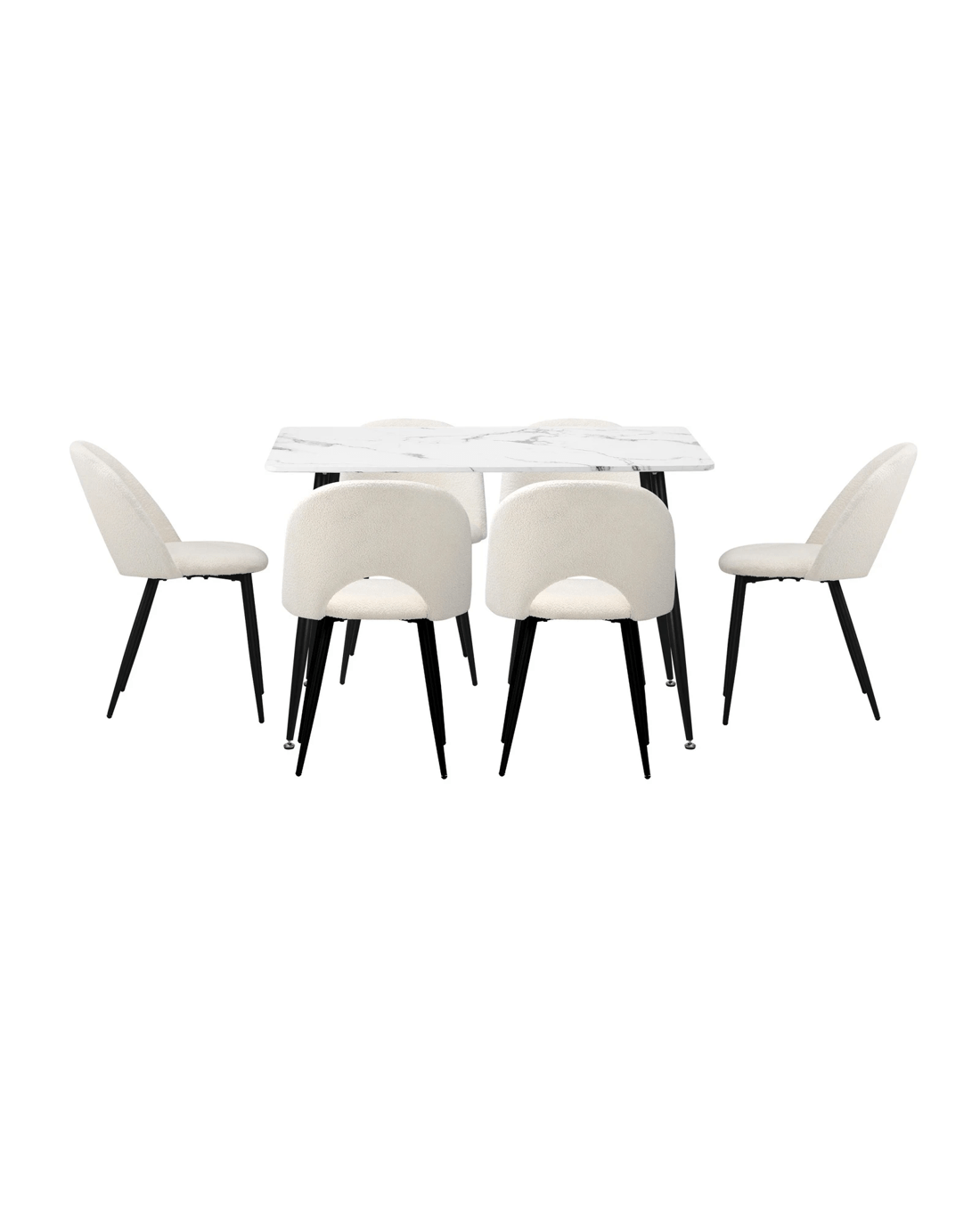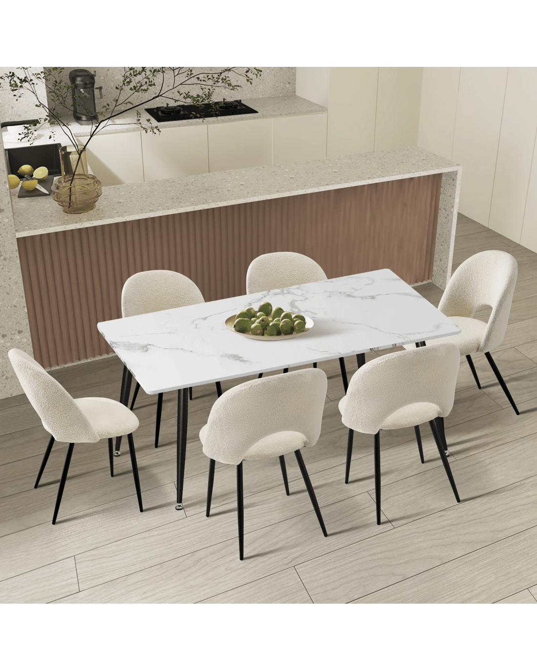 Immerse yourself in the epitome of modern elegance with our Dining Table and Sherpa Dining Chairs Set by Oikiture. The sleek lines of the contemporary dining table set the stage for a dining experience that seamlessly blends sophistication with comfort. Paired with our sumptuous Sherpa Dining Chairs, the set becomes a statement piece that captures attention and admiration.