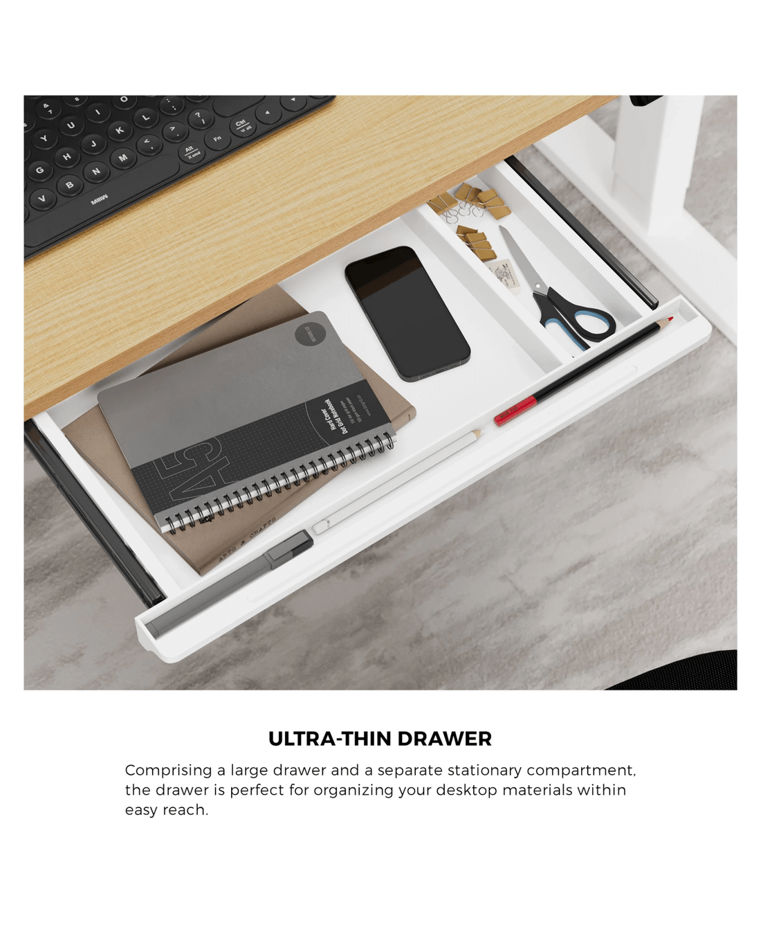 Not least, an ultra-thin drawer is aptly included with the desktop to help organise and keep all your desktop working paraphernalia close at hand within a spacious drawer and separate stationary compartment.
