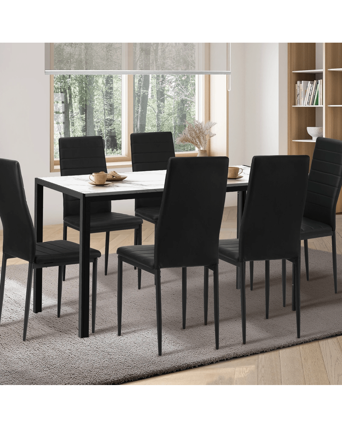 Better still, the particle board dining table comes in a white marble-like finish with a black frame and legs to suit your dining set-up preference. This 140cm long dining table with 6 cozy chairs is just the right size for a small to medium-sized family to enjoy their meals together.
