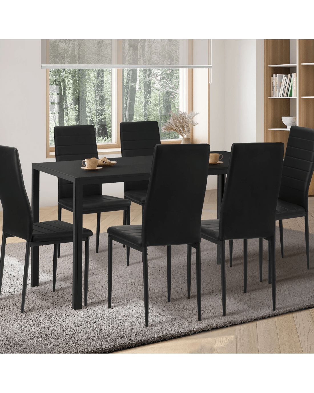 Better still, the particle board dining table comes in a plain black on black finish with a black frame and legs to suit your dining set-up preference. This 140cm long dining table with 6 cozy chairs is just the right size for a small to medium-sized family to enjoy their meals together.