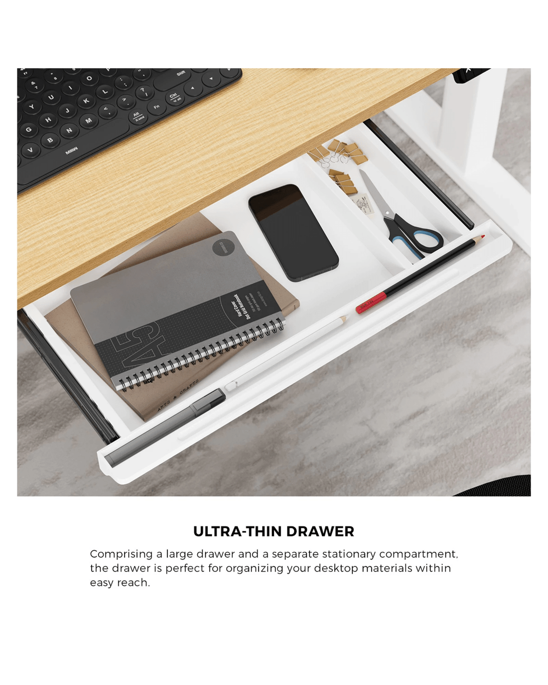 Not least, an ultra-thin drawer is aptly included with the desktop to help organise and keep all your desktop working paraphernalia close at hand within a spacious drawer and separate stationary compartment.