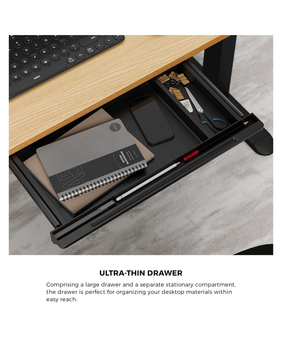 Not least, an ultra-thin drawer is aptly included with the desktop to help organise and keep all your desktop working paraphernalia close at hand within a spacious drawer and separate stationary compartment.
