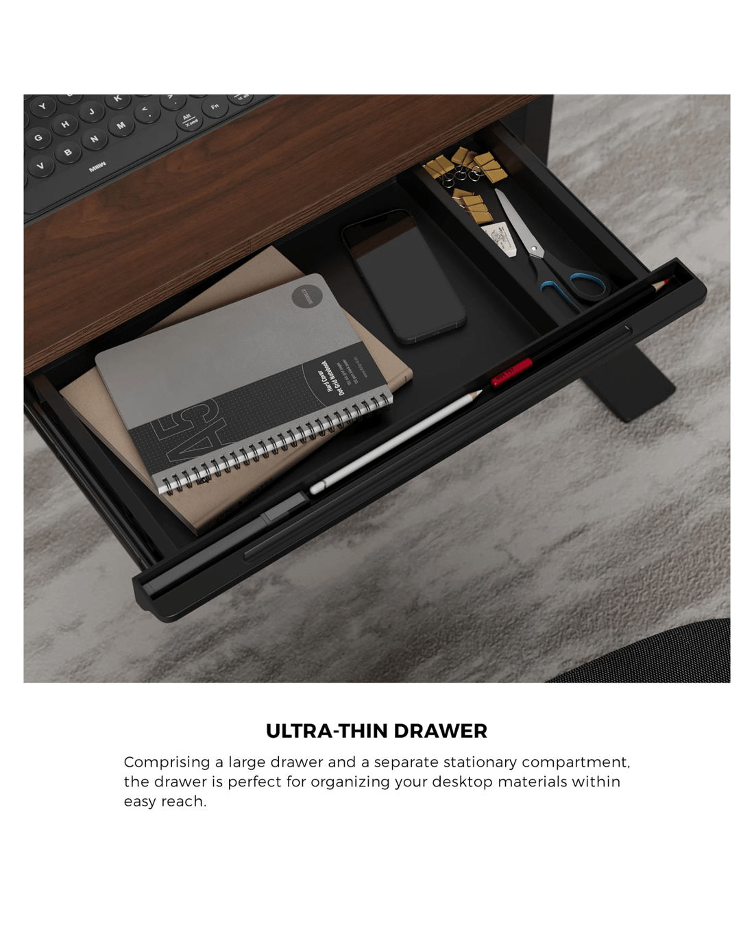 Not least, an ultra-thin drawer is aptly included with the desktop to help organise and keep all your desktop working paraphernalia close at hand within a spacious drawer and separate stationary compartment.