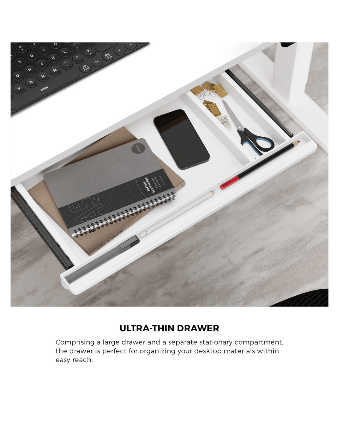 Not least, an ultra-thin drawer is aptly included with the desktop to help organise and keep all your desktop working paraphernalia close at hand within a spacious drawer and separate stationary compartment.