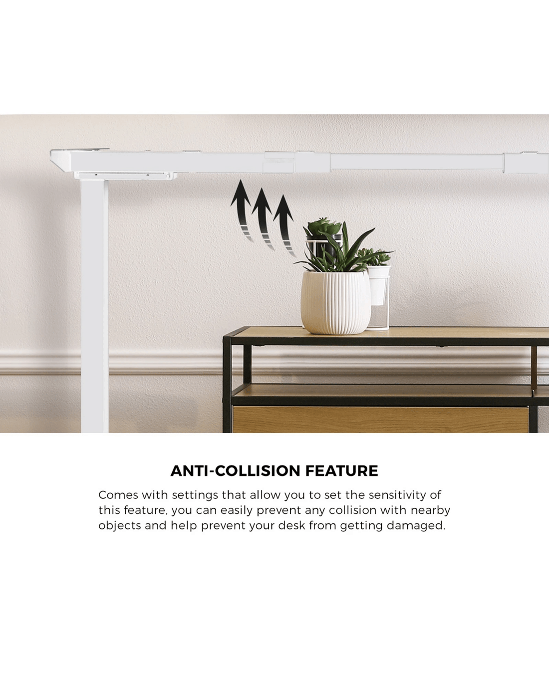 Better still, the single motor works efficiently, smoothly and silently to get the desktop to your desired height within seconds. And all this while, a built-in anti-collision detection ensures no accidental knocks along the way. Not least, the extended feet with adjustable footpads ensure a steady frame at all times.