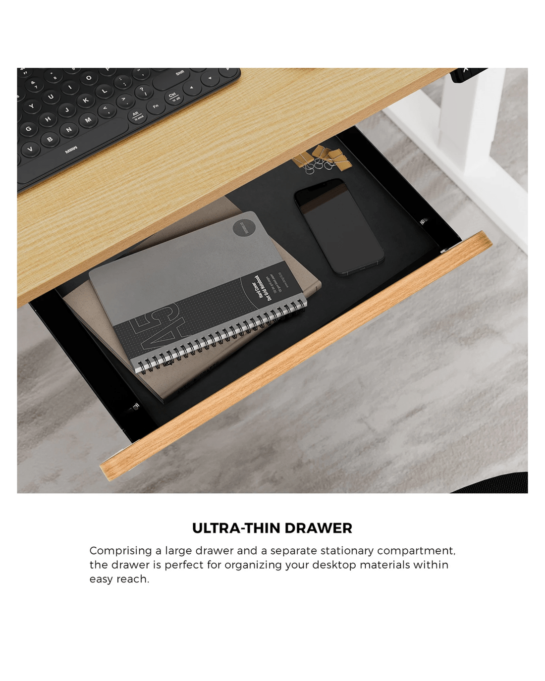 Not least, a buffer design drawer is aptly included with the desktop to help organise and keep all your desktop working paraphernalia close at hand within a spacious storage area with plastic separators included.