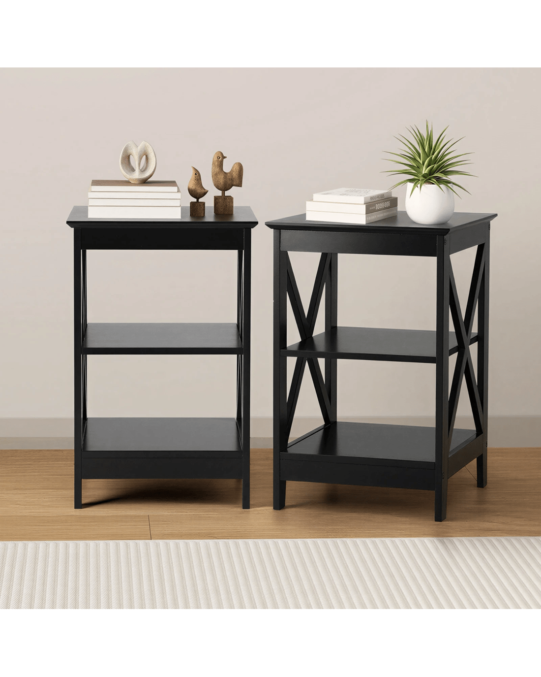 Beyond its aesthetic appeal, the side table offers versatile functionality. The flat top surface provides an ideal platform for showcasing your favorite decor items, while the lower shelfs serve as practical storage or display space for books, magazines, or essentials.