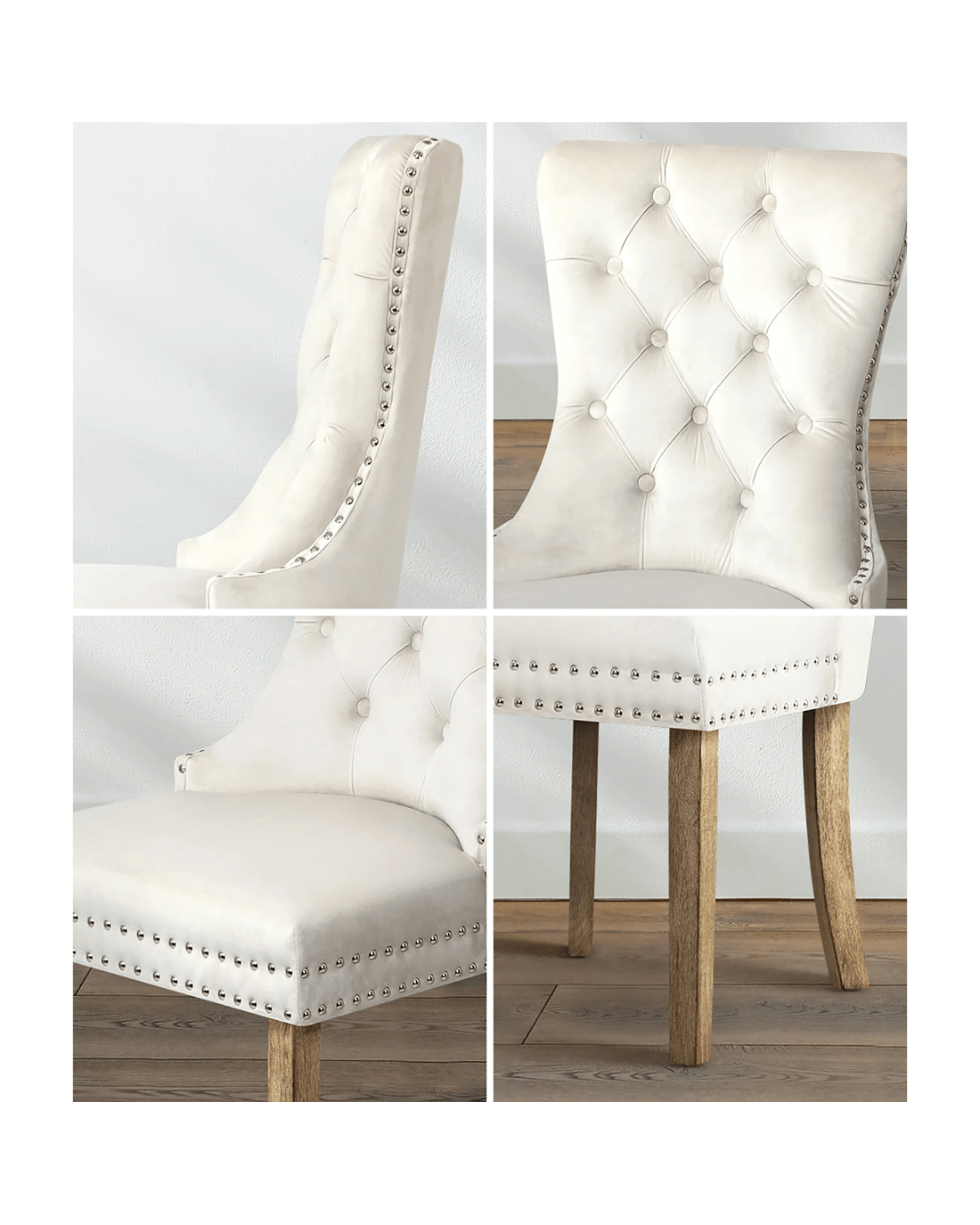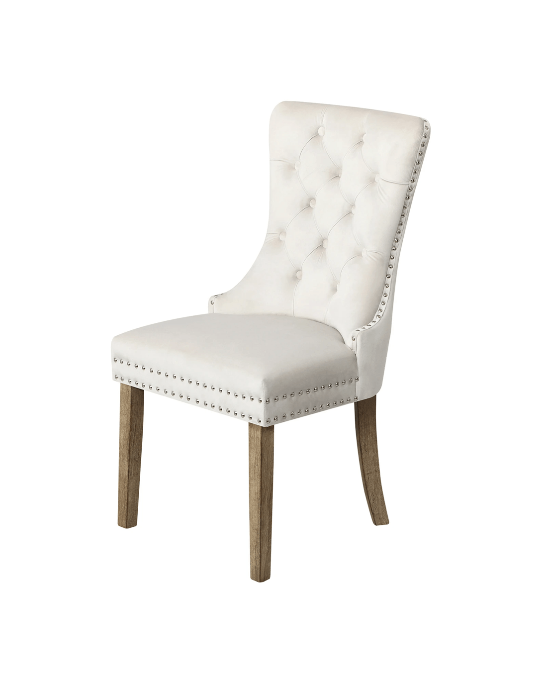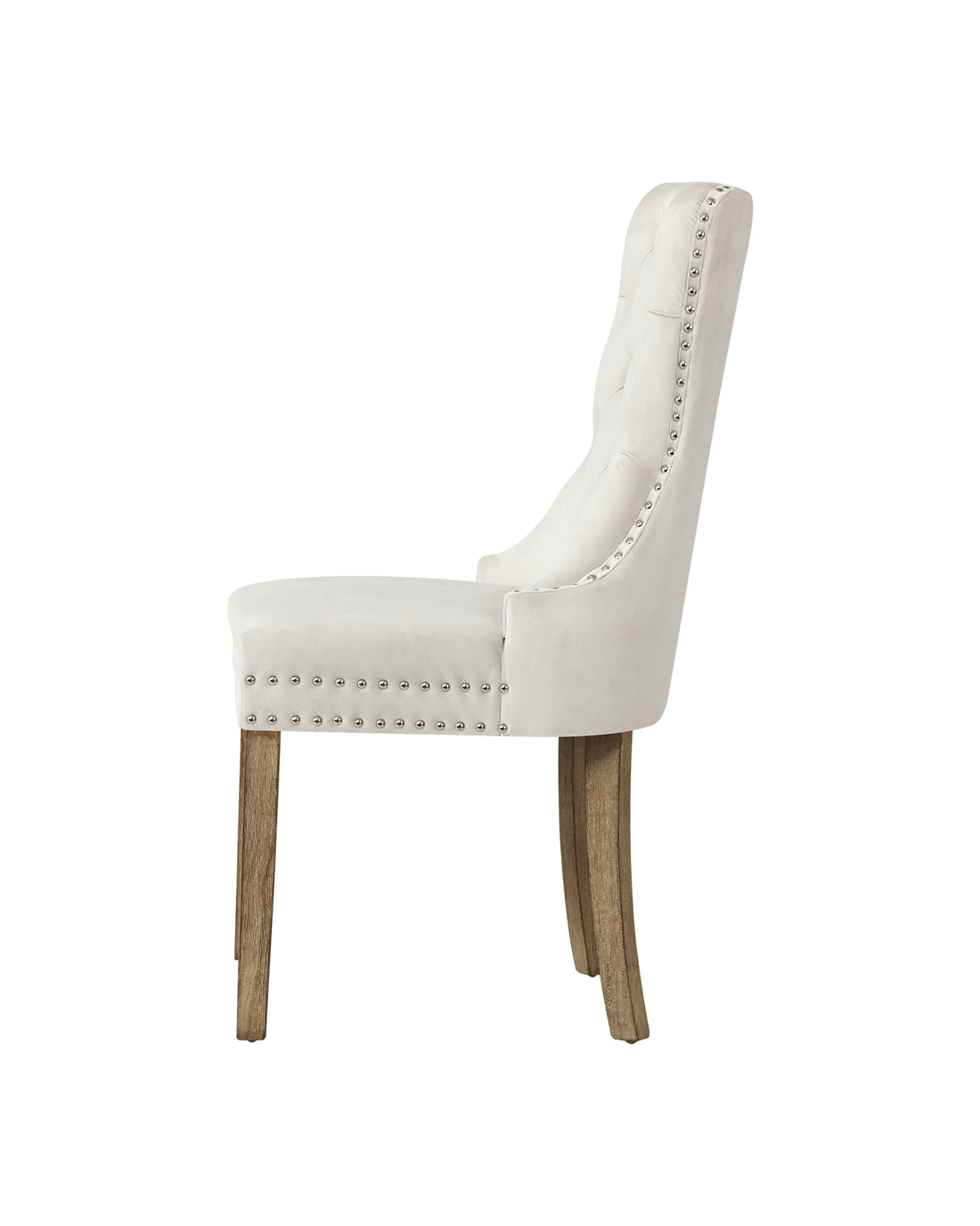 The contoured high back backrest is designed to offer greater support that wraps around your upper body while the well-padded high-density foam seat is as comfortable as ever with every sitting. Better still, the interior side of the seat are fitted with silver stud trim and button tufted backrest oozes class and sophistication all round. With its sturdy wooden legs, the dining chair is also extremely stable and handle up to 150kg in weight capacity.