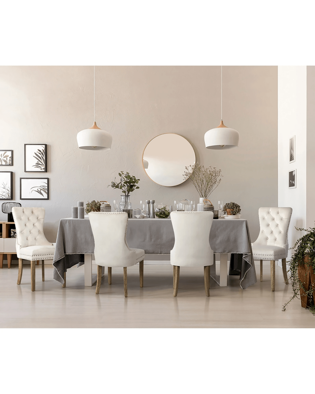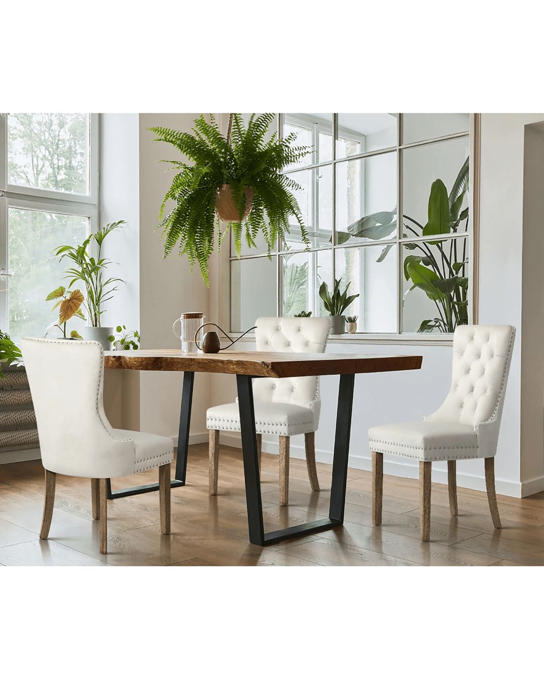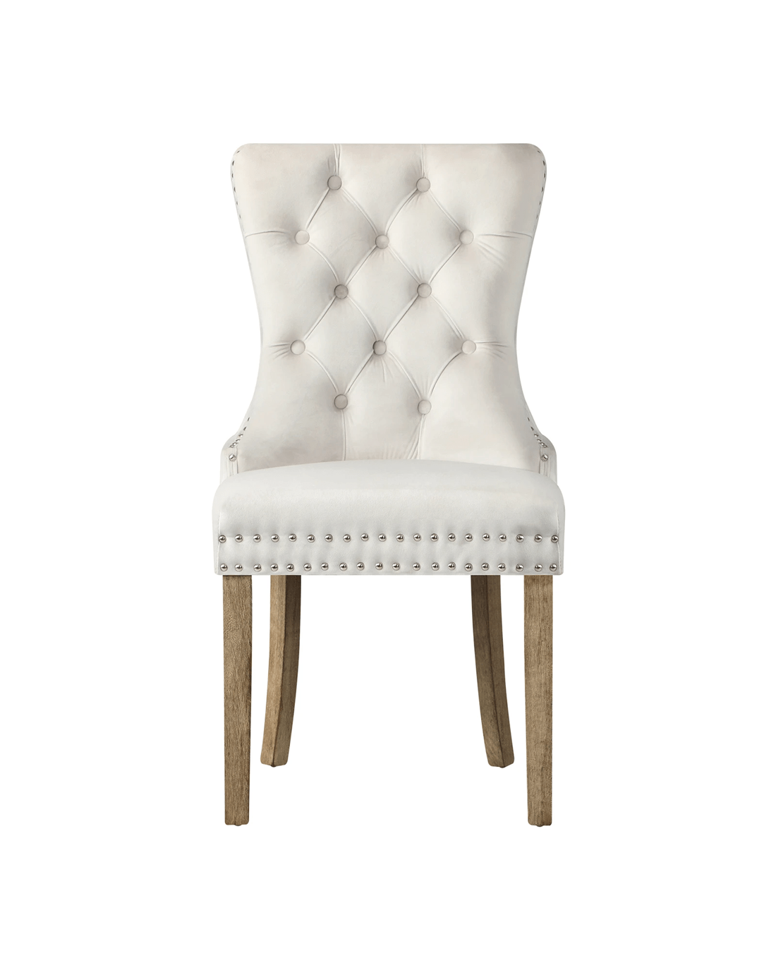 The contoured high back backrest is designed to offer greater support that wraps around your upper body while the well-padded high-density foam seat is as comfortable as ever with every sitting. Better still, the interior side of the seat are fitted with silver stud trim and button tufted backrest oozes class and sophistication all round. With its sturdy wooden legs, the dining chair is also extremely stable and handle up to 150kg in weight capacity.