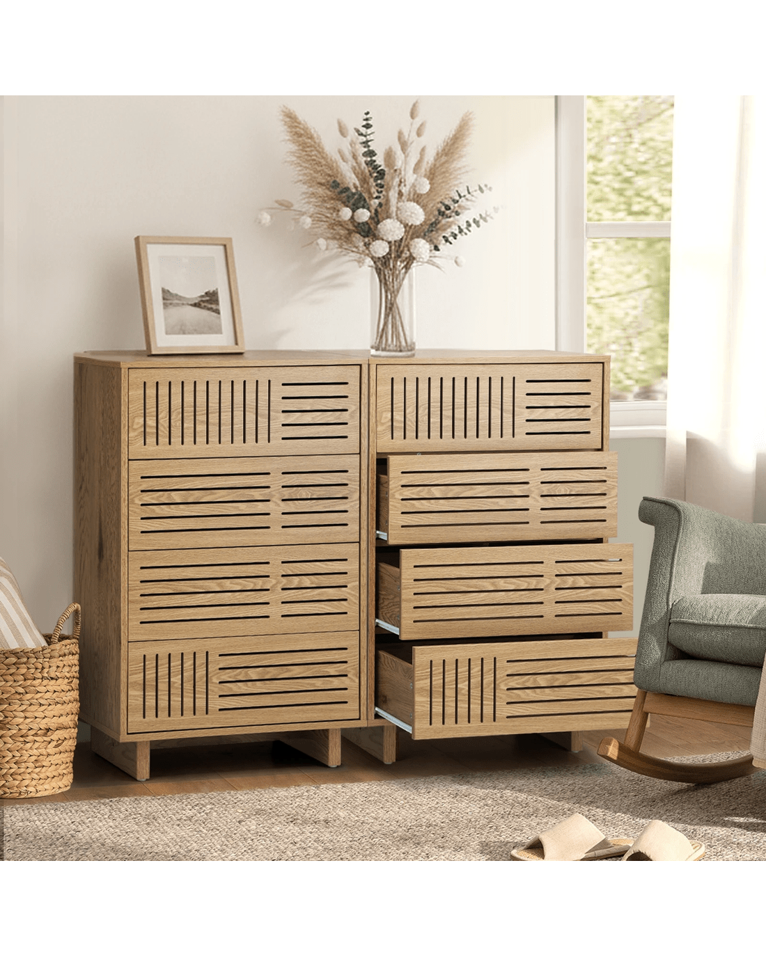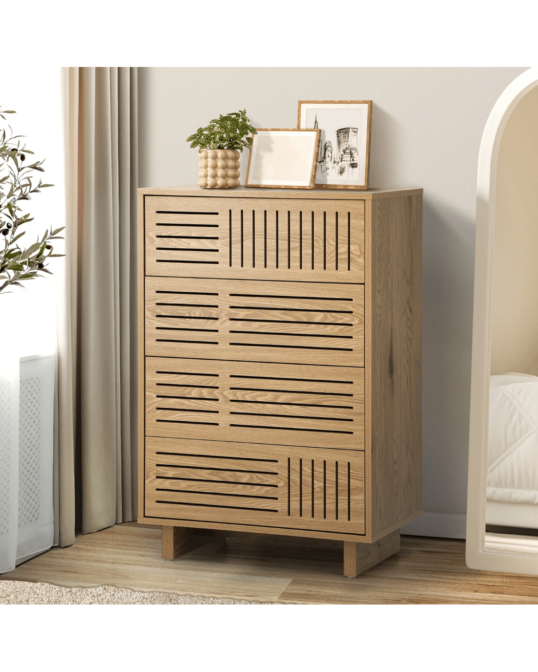 Time to refresh your existing chest of drawers with this eye-catching piece from Oikiture. With a very practical and equally fascinating design, our chest of drawers features a neutral wood-inspired finish with stylish gap line accents on each drawer front to create interesting aesthetic embellishments. Thoughtful touches that render a unique presence.
