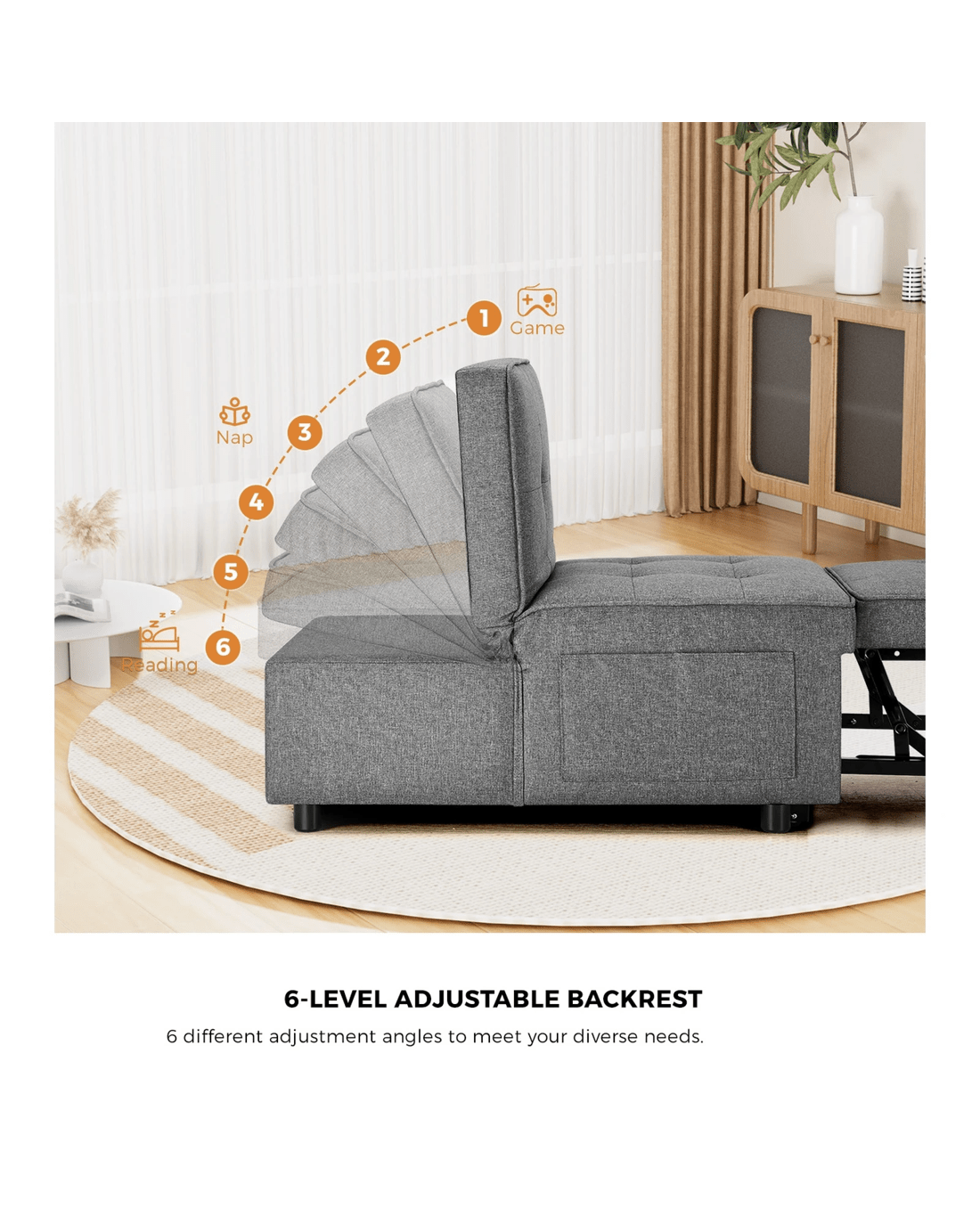 Equipped with six adjustable positions for the backrest, you can turn your sofa bed into the best seat in the house for watching TV, reading, or keeping up with your social media, or nestle it down for relaxation, napping or sleeping. Its 4-in-1 convertible feature is certainly much appreciated in every way. From its desirable versatility to its quiet portability to its space-saving utility.