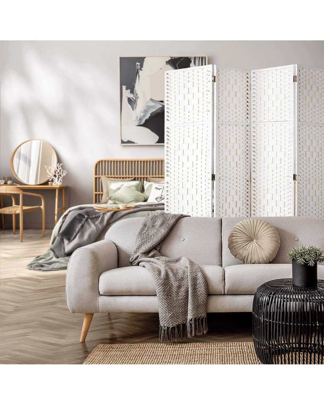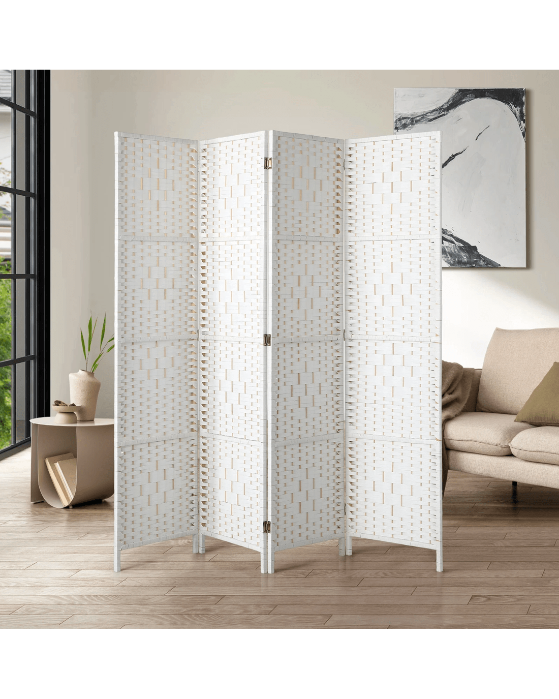 This is great as a privacy screen and also create a separation of spaces. The design of this room divider offers a good amount of privacy, with its tall design and stunning weaved rattan panels that also allows natural light to shine through.