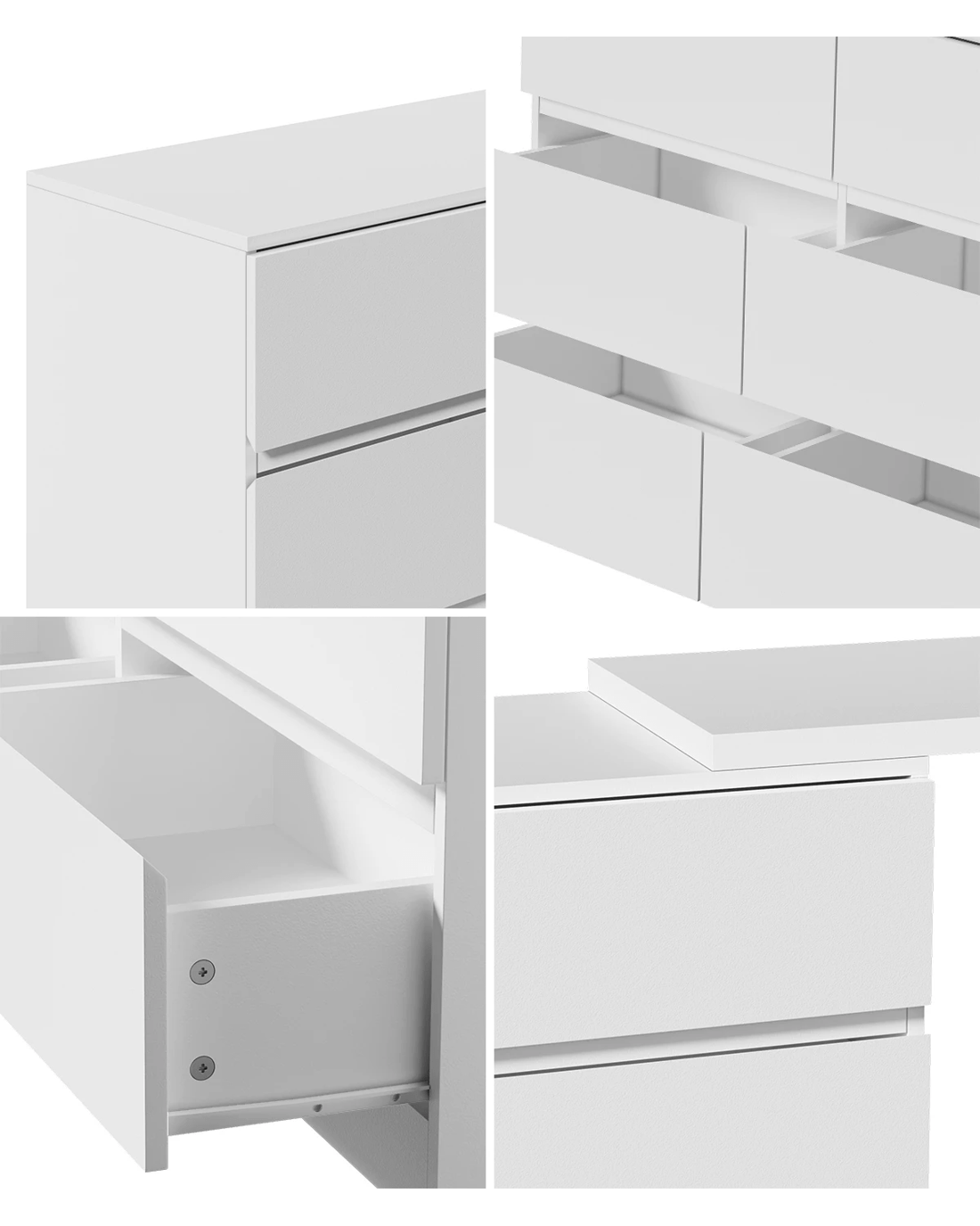 With six sizeable drawers, the handle-free chest of drawers provide cavernous storage space with effortless opening and closing, especially when laden with a generous amount of storage items. Plus, you'll be assisted by smooth metal runners that make using this chest of drawers a breeze and never a chore.
