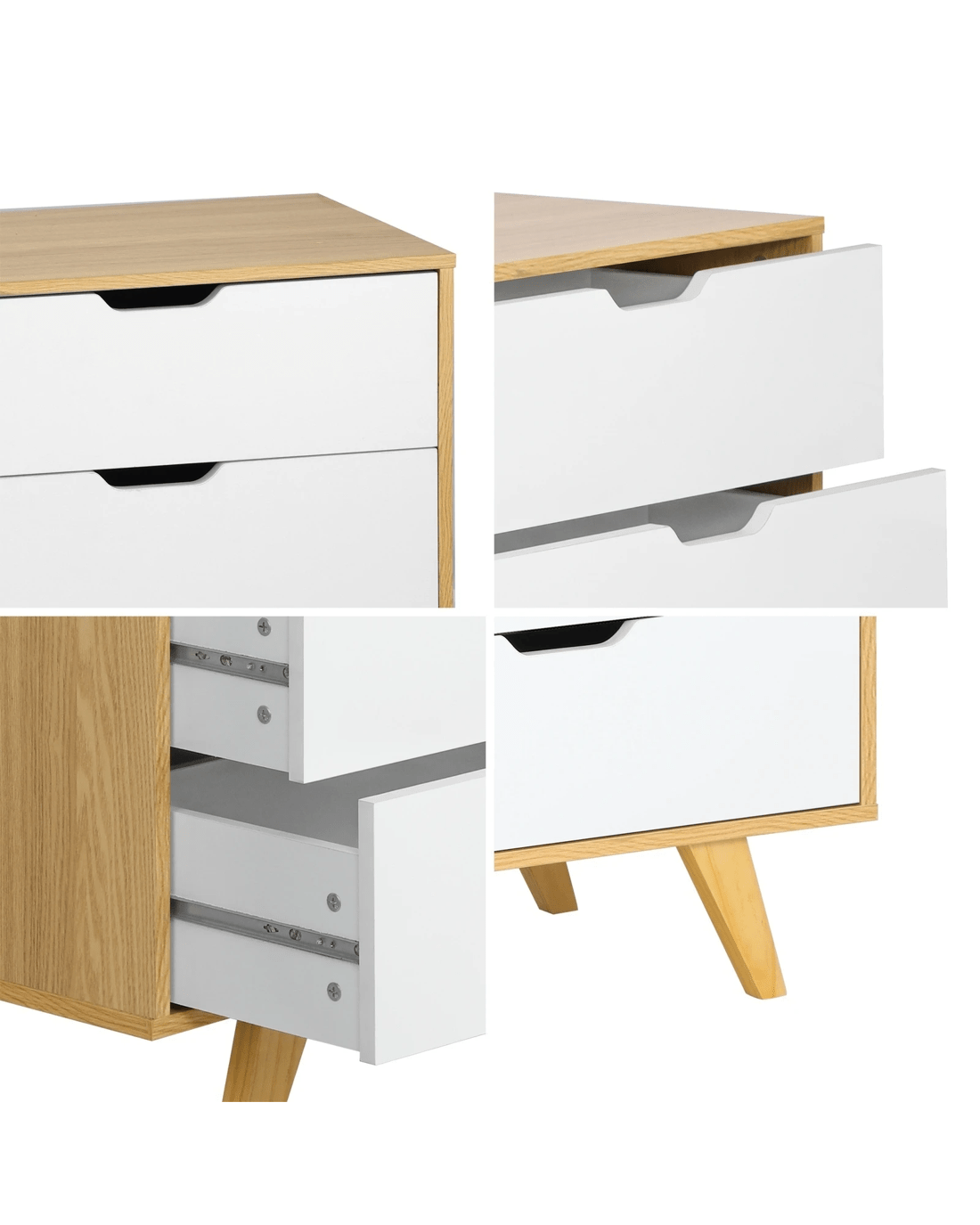 Constructed with 15mm particle board and quality components, the chest of drawers maintains a good sense of structure and durability. Plus, the splayed pine wood legs are strong to the task and make for easy cleaning underneath the chest of drawers. The attention to detail is meticulous, evidenced by the fine workmanship from top to bottom. And maintaining the chest of drawers in its pristine condition is just a simple wipe away. Assembly is a breeze too with the easy-to-follow instructions.