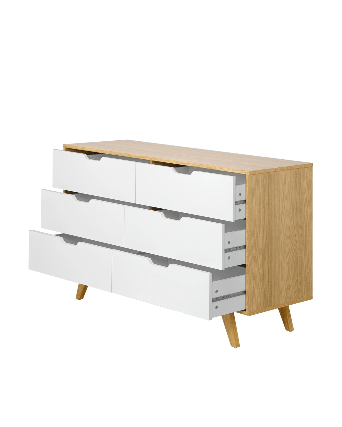 The six drawers provide cavernous storage space while flushed air gap handles on each drawer ensure hassle-free effortless opening and closing. Plus, you'll be assisted by the smooth powder-coated metal runners that make using this chest of drawers a breeze and never a chore, especially when laden with a generous amount of storage items. Plenty more display space is also found at the top of the chest of drawers that allows this versatile item to be used in a variety of decor ideas throughout your home. Bedroom, study, living room or hallway. The choice is yours to detail.