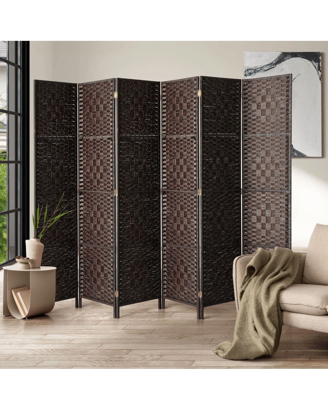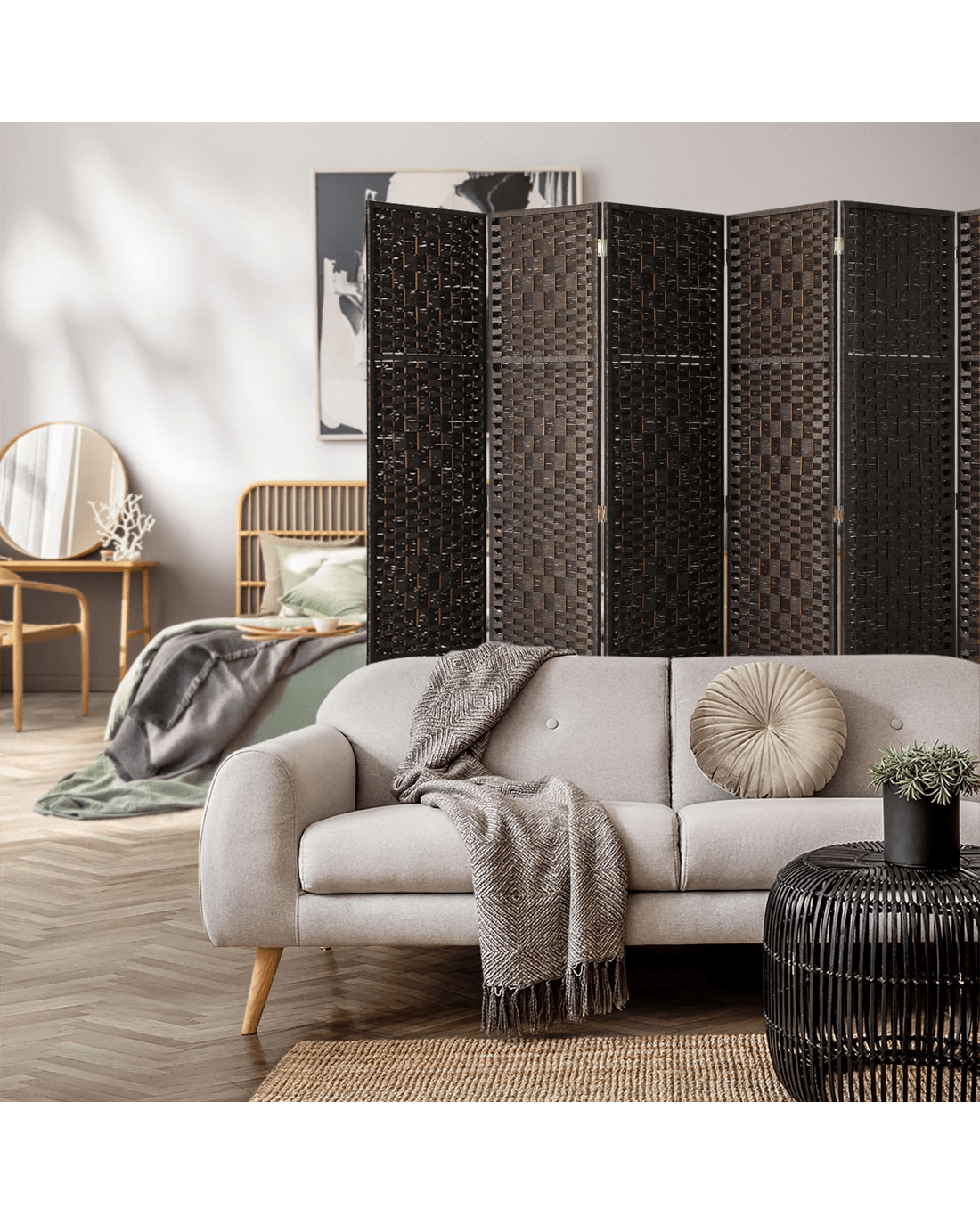 This is great as a privacy screen and also create a separation of spaces. The design of this room divider offers a good amount of privacy, with its tall design and stunning weaved rattan panels that also allows natural light to shine through.
