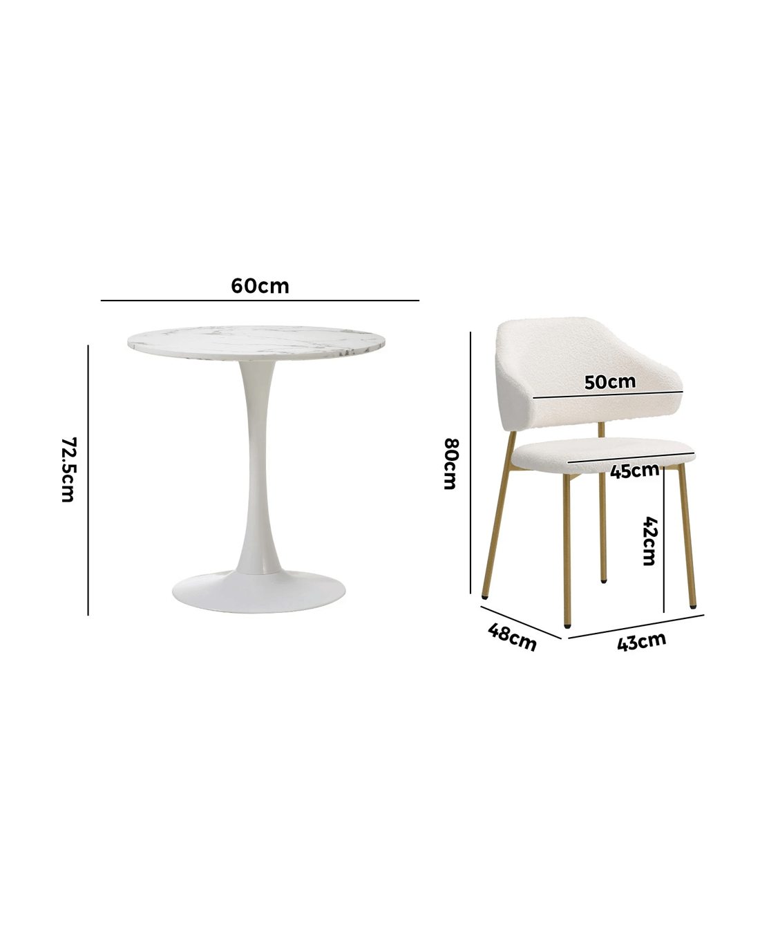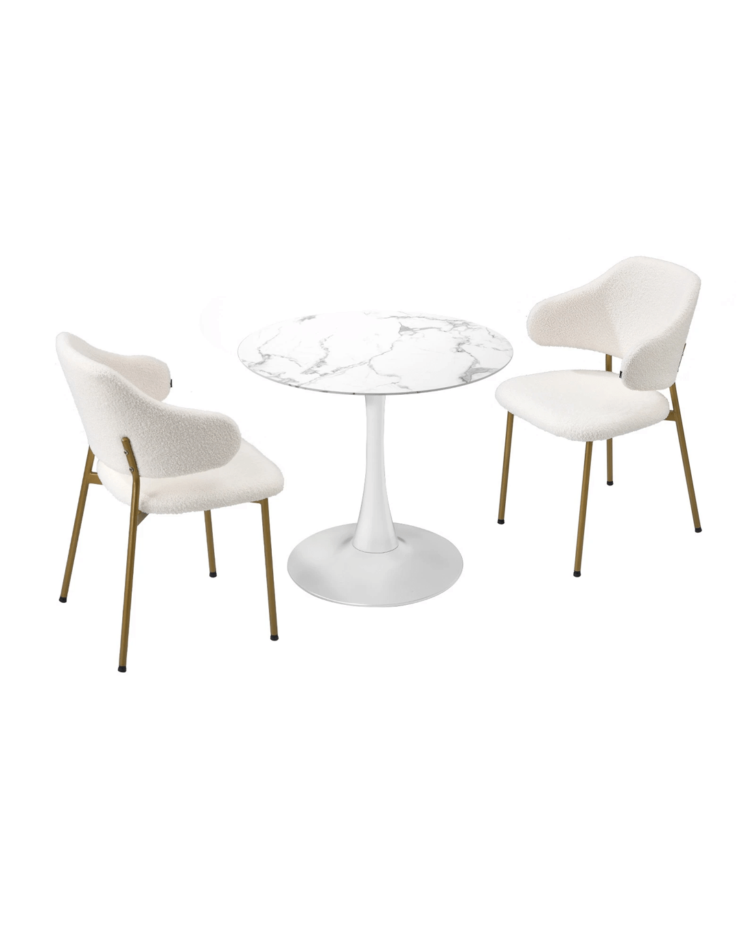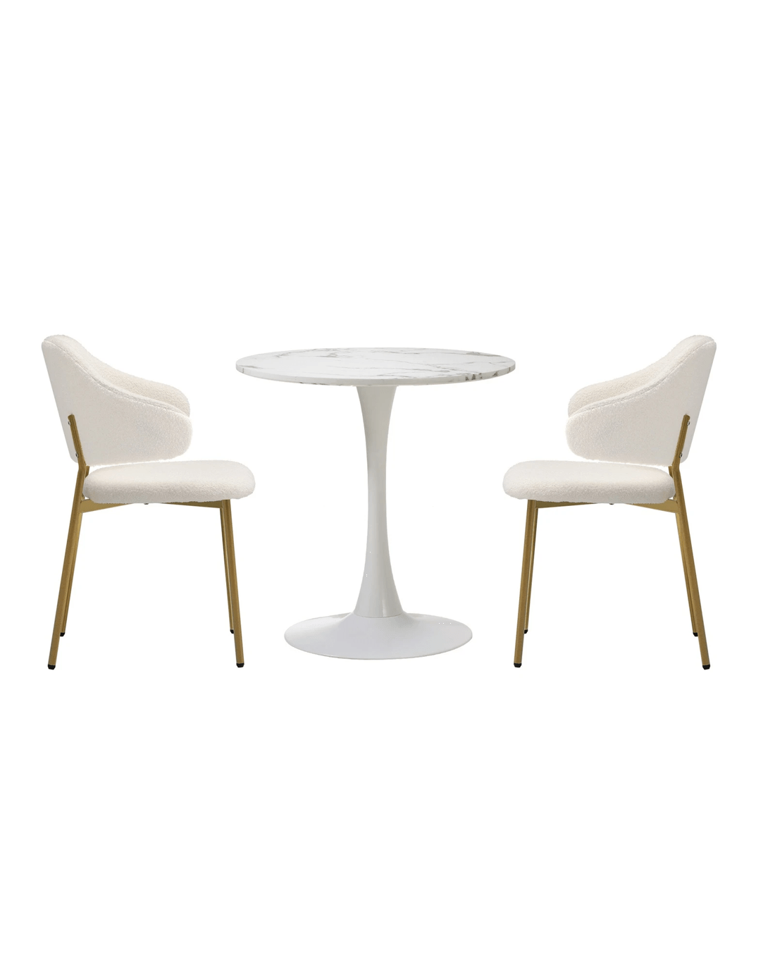 Sold by Kamprad's Oikos 1943Oikiture 60cm Round Dining Table With 2x Sherpa Dining Chairs Gold Metal Leg - White