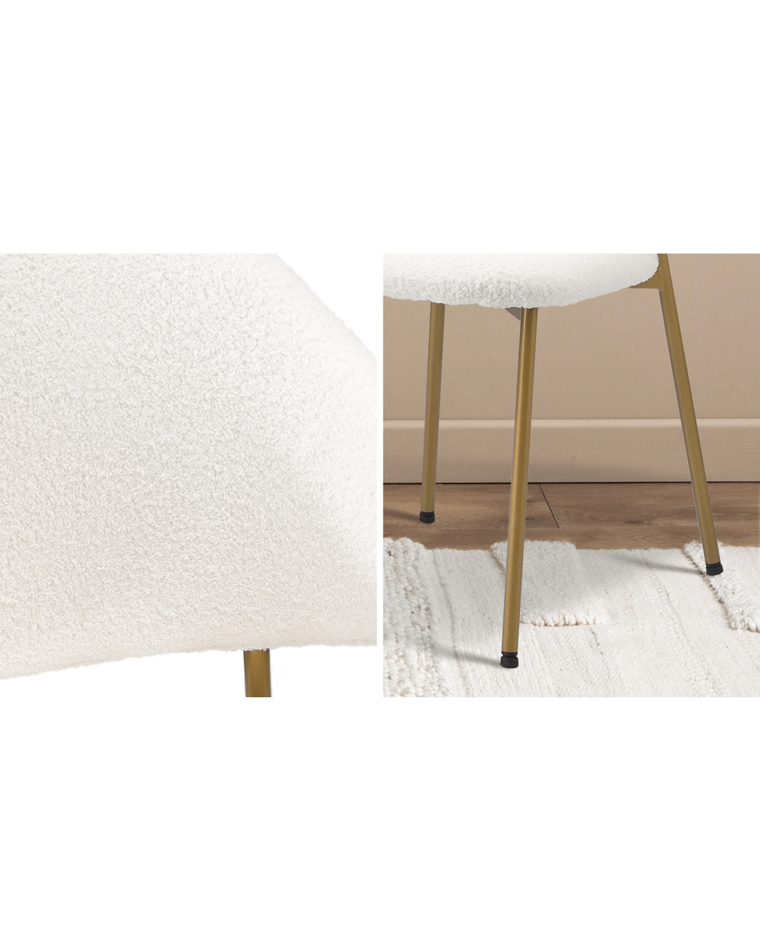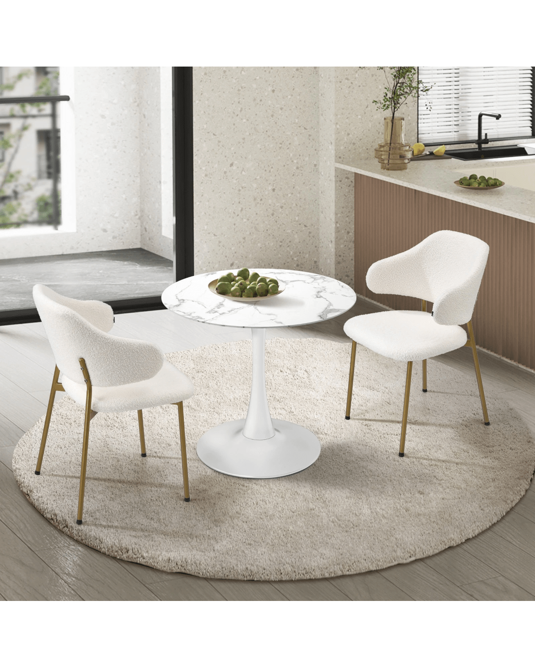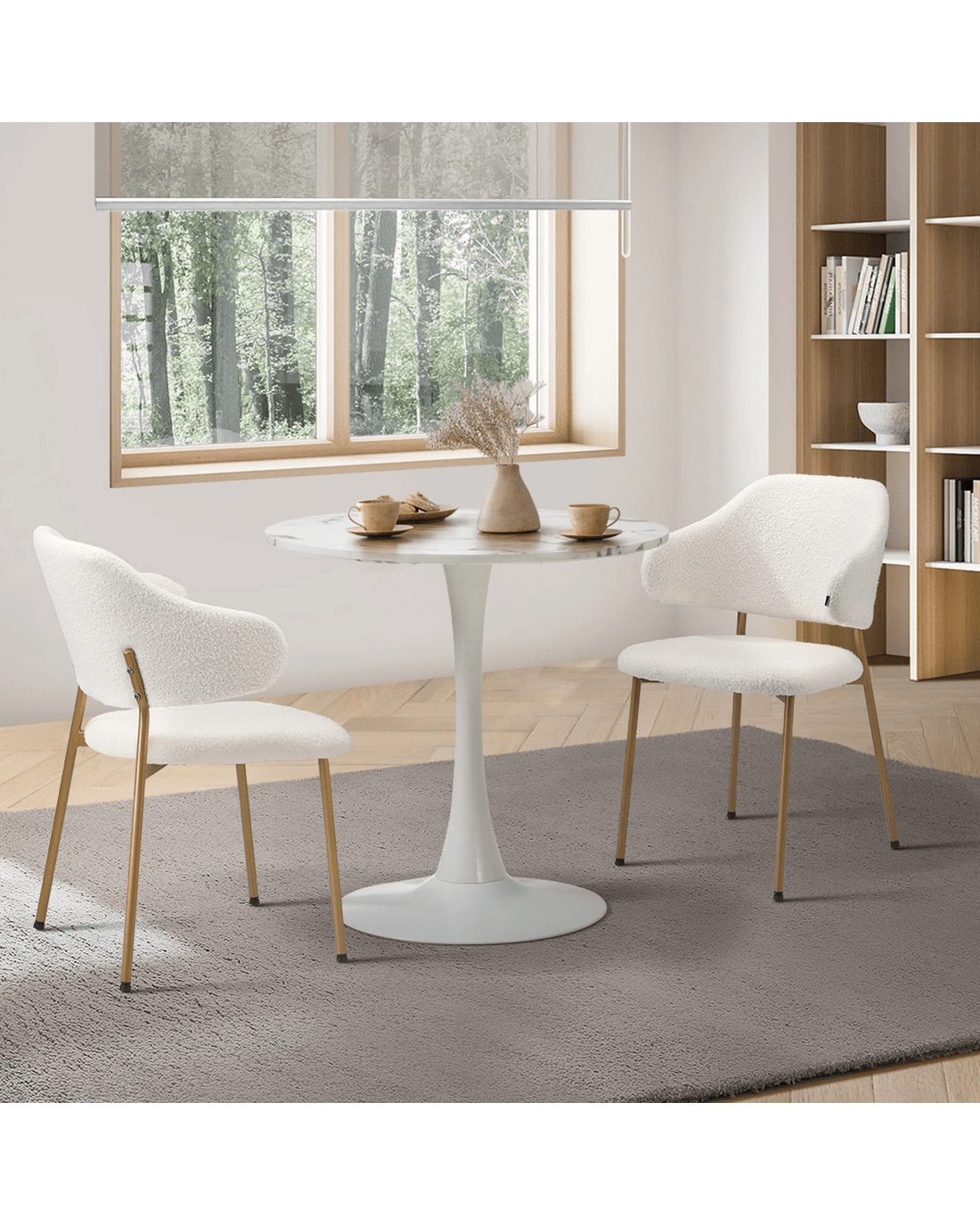 Sold by Kamprad's Oikos 1943Oikiture 60cm Round Dining Table With 2x Sherpa Dining Chairs Gold Metal Leg - White