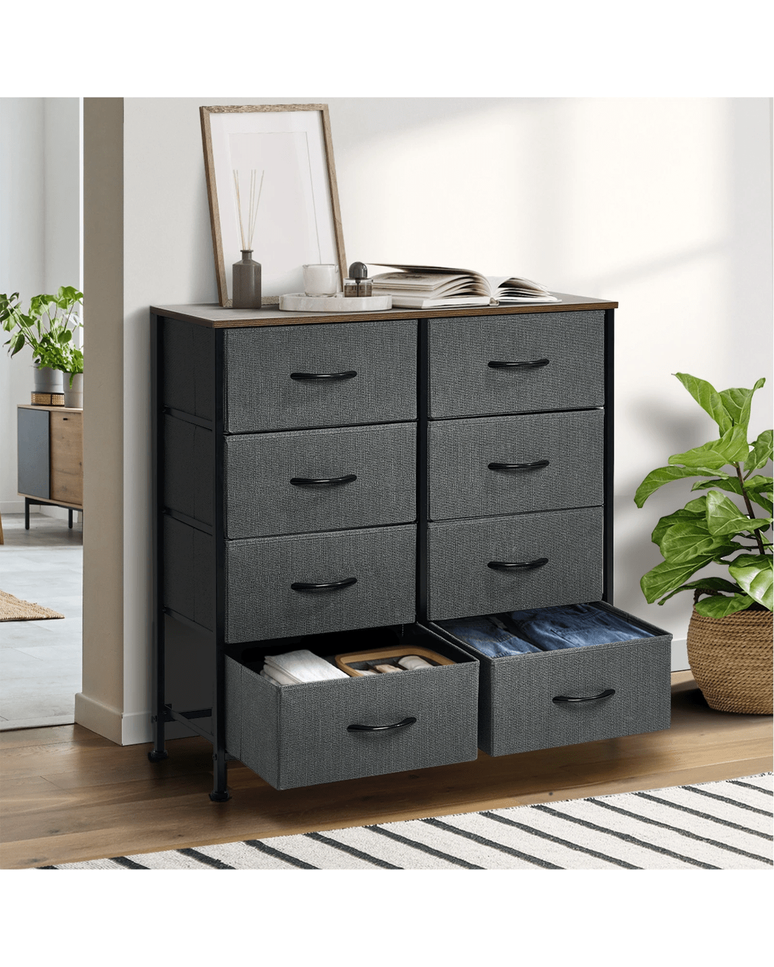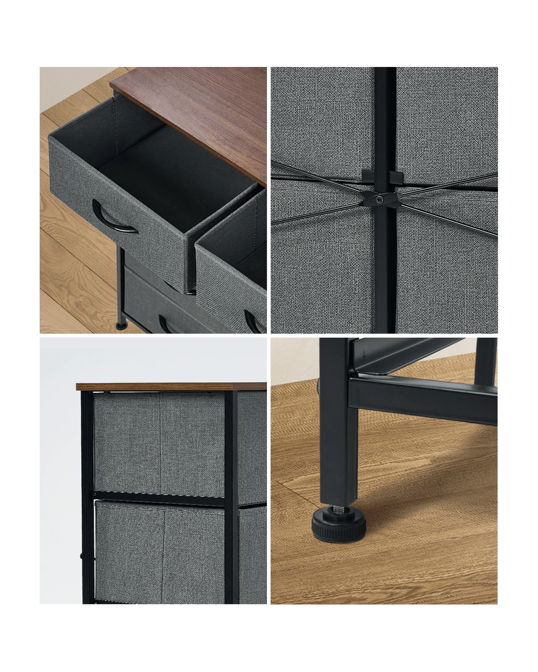 Constructed with a composite of materials and an X-shaped crossbar support, the chest of drawers maintains a good sense of structure and durability. Better still, the sturdy steel legs are strong to the task and set at a practical height for easy cleaning underneath the chest of drawers.