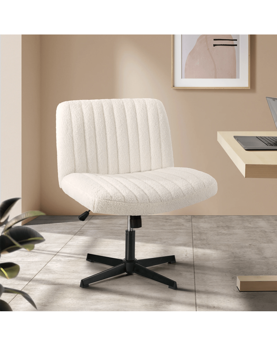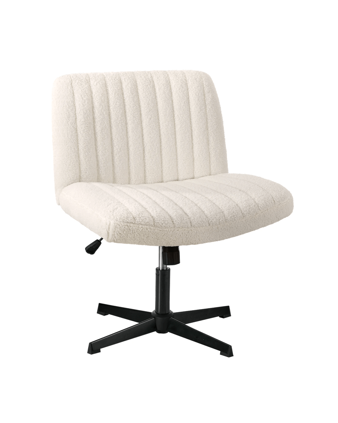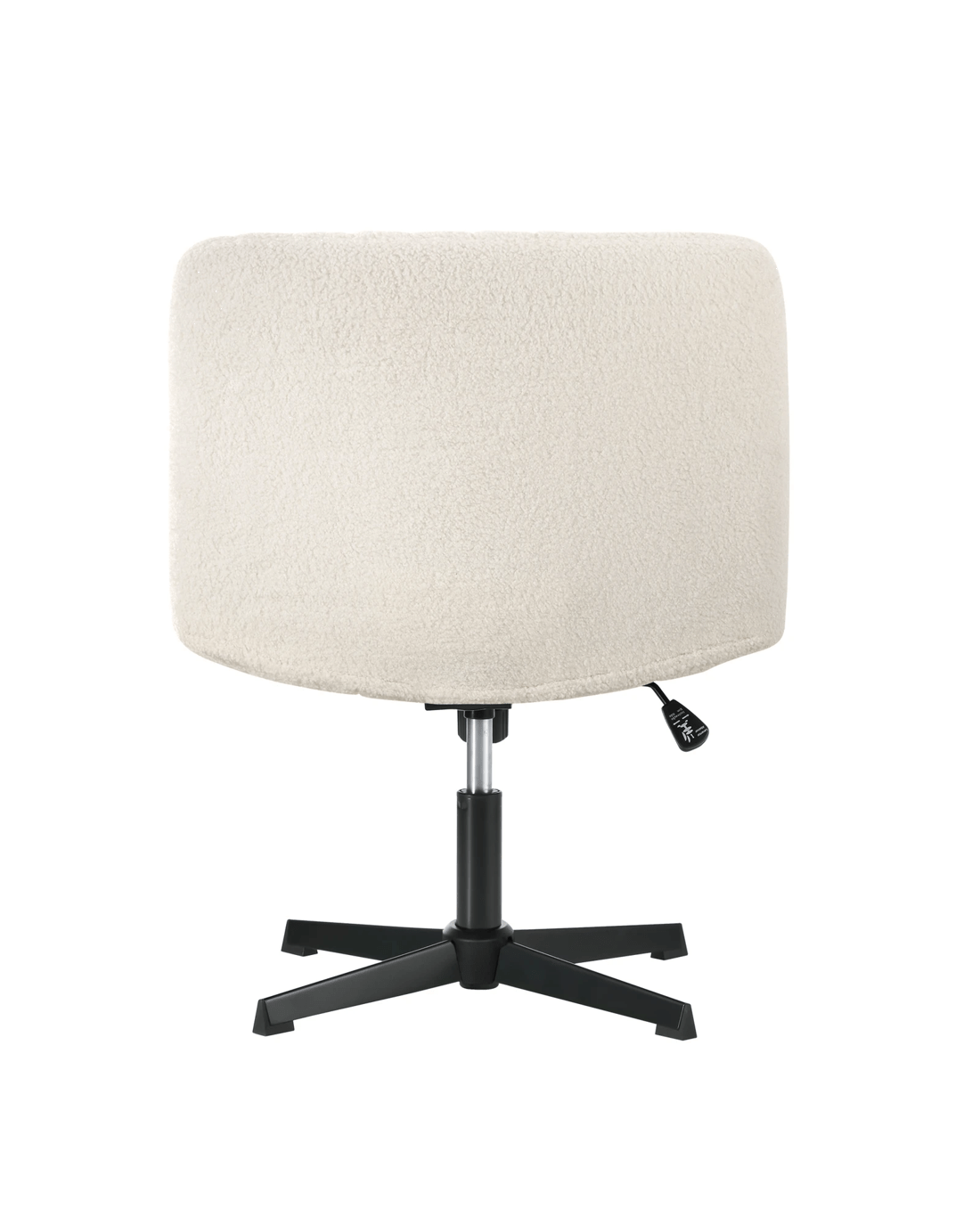 Crafted with a unique cross-leg base, this chair stands out as a symbol of modernity and stability. Its sleek Sherpa white fabric seat adds a touch of luxury to your workspace, ensuring both visual appeal and comfort. Our chair features a dynamic rocking backrest that allows you to gently sway and recline while you work. This soothing motion promotes relaxation and helps reduce stress during long hours at your desk. It is a game-changer for those who appreciate a little movement while they work.